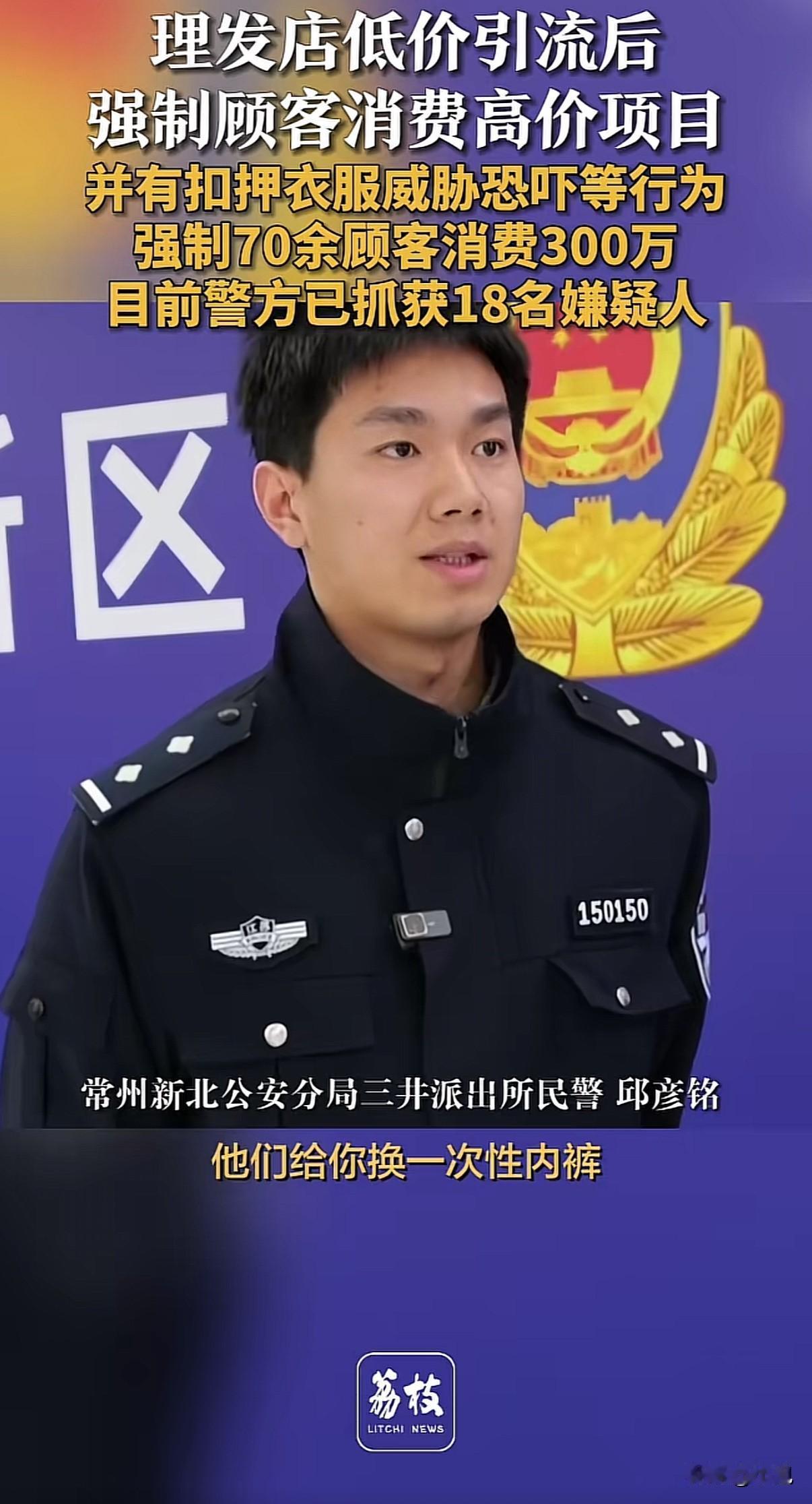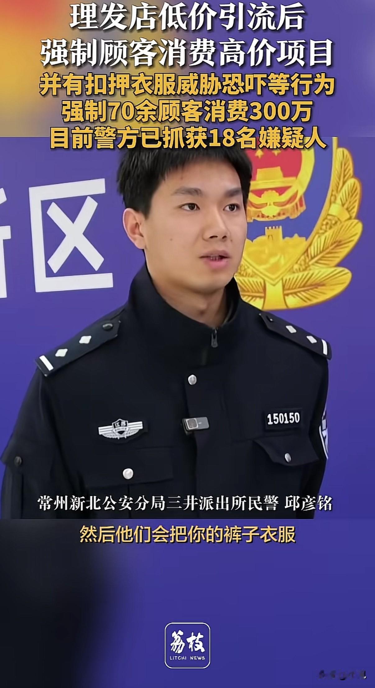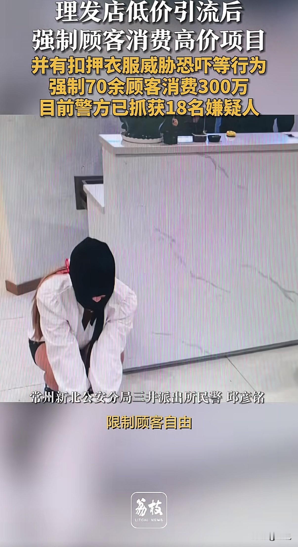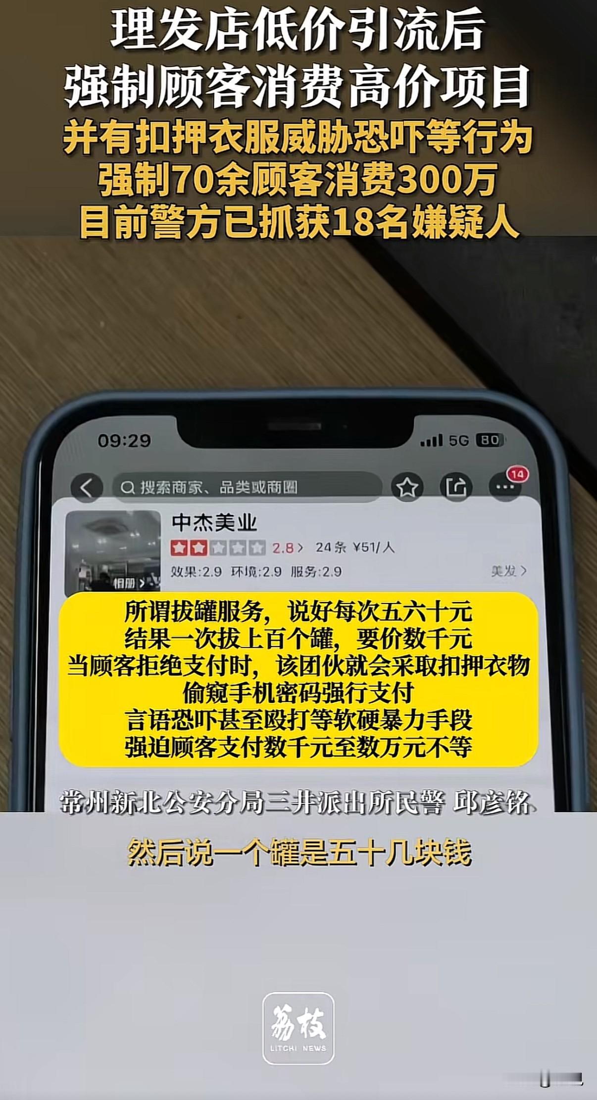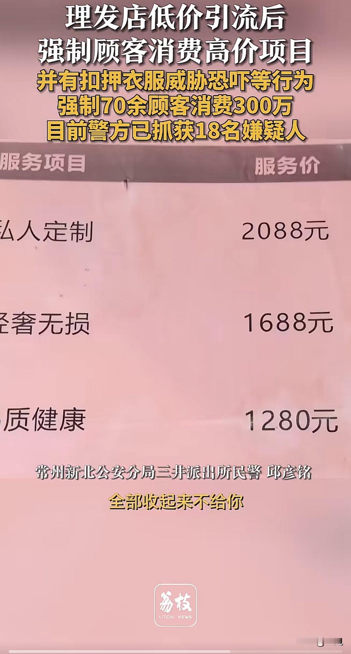 30元体验4次美发?常州一家理发店让70多人花了300万,有人出来时脸上还挂着泪。 这事就发生在常州中杰美发店。他们用“30元体验4次”的优惠卡吸引顾客上门,等客人躺到美容床上,事情就完全变样了。 一位大学生回忆,店员边给她梳头边说:“你头发问题很严重,不做护理以后会掉光。”她还没反应过来,已经被带到里间做头皮检测。 检测结果让她心惊肉跳。“你看,毛囊全堵了,现在不做修复,过两年准秃头。”店员语气严肃。 她犹豫时,店员已经打开一瓶护理液:“我们先做一次试试,原价588,给你体验价288。” 做完护理,账单让她傻眼了。“不是288吗?” 店员指着价目表:“288是一支的价格,你用了六支,加上服务费,总共1988。” 她想理论,三个男店员围过来。其中一个拿起她的手机:“密码多少?自己输还是我帮你?” 最后她被迫转走两个月的生活费。走出店门时,腿还在发抖。 拔罐项目更是离谱。说好60元一次,结果一次给顾客拔了上百个罐。 “你这湿气太重了,不排出来要得大病的。”美容师边拔罐边吓唬一位老人。 拔完罐结账,店员拿出计算器:“一个罐子50元,你用了120个,共6000元。” 老人惊得站起来:“不是说好60吗?” 店员冷笑:“60是一个罐子的价钱,谁跟你说全背60了?” 老人的外套被扣在储物柜,手机被店员“保管”着。最后他不得不交出银行卡,刷走了四个月养老金。 店里有个规矩:专挑好说话的客人下手。学生、年轻女孩、老年人是主要目标。这些人往往脸皮薄,不敢激烈反抗。 有个姑娘被逼到墙角,店员偷看到她输入支付密码,直接拿过手机操作转账。转完还“贴心”地说:“我们这是为你好,美丽是需要投资的。” 更可怕的是,有顾客反映,做护理时被偷偷拍照。“不付钱就把你这些丑照发到网上。”店员这样威胁。 周边商铺的员工说,经常看到有人红着眼睛从理发店出来。“有个女孩边走边哭,妆都花了。” 这家店开了不到半年,却让那么多人心甘情愿掏出几千几万?真相是,没有一笔交易是心甘情愿的。 警方调查发现,他们有一套完整的话术本。从如何吸引顾客进店,到怎样层层加码推销,再到最后威胁手段,每个环节都设计好了。 现在18个人被抓了,店也关了。但留给我们的思考很多:为什么这样的店能存在这么久?为什么那么多受害者不敢第一时间报警? 或许,正是因为抓住了人们“破财消灾”的心理,这帮人才如此肆无忌惮。 下次遇到“优惠得离谱”的服务,真要多个心眼了。天上不会掉馅饼,但地上确实有陷阱。