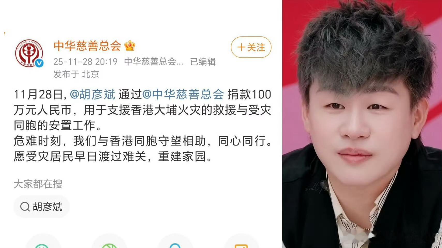 胡彦斌捐款 为胡彦斌的公益初心点赞!香港大埔火灾捐100万定向帮扶,过往助力女童