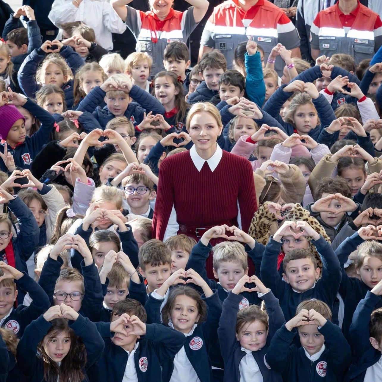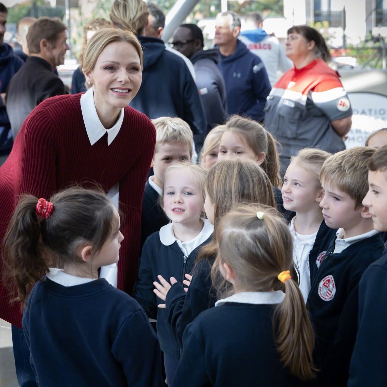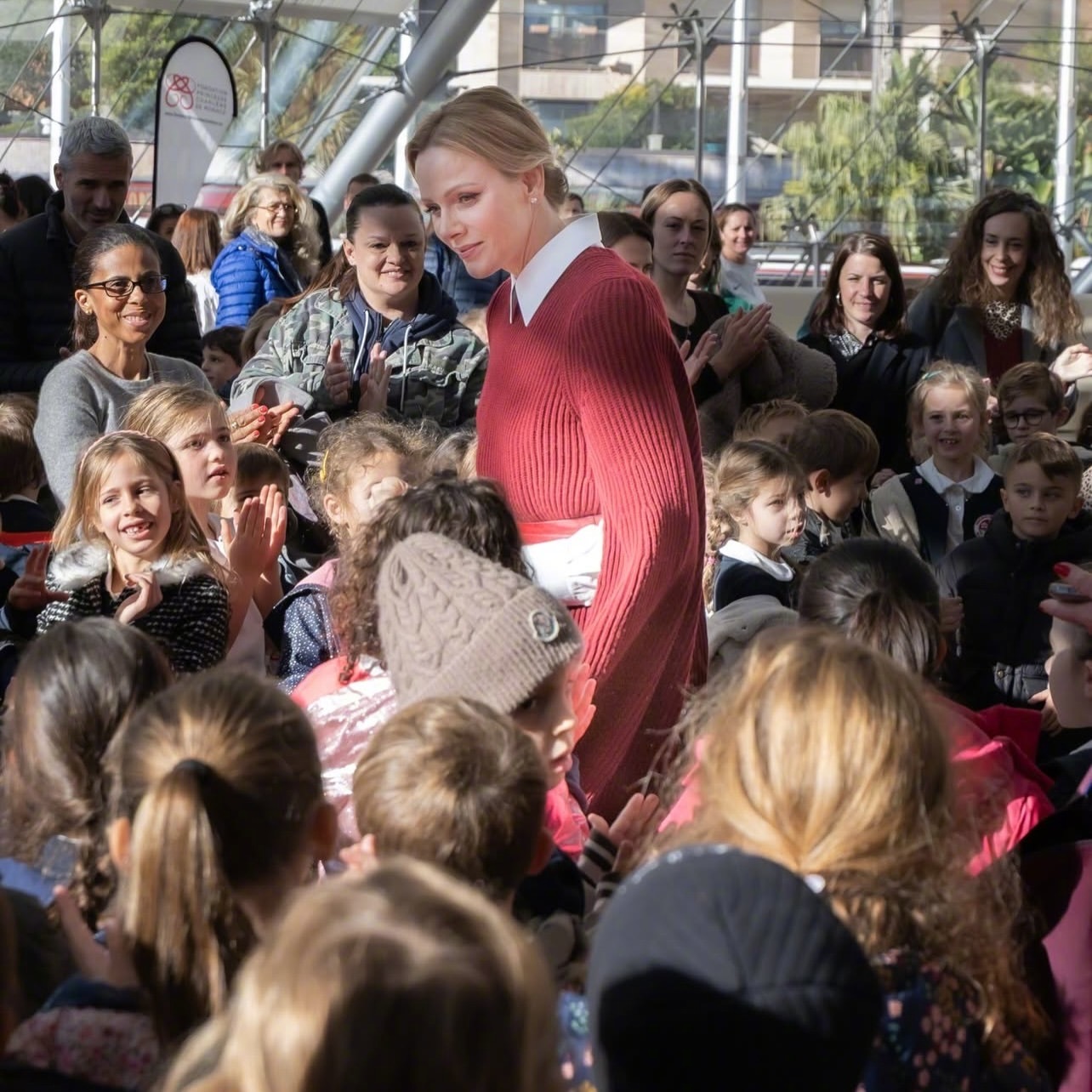 当地时间11月28日,摩纳哥夏琳王妃身穿Max Mara 覆盆子色斗篷连衣裙和腰