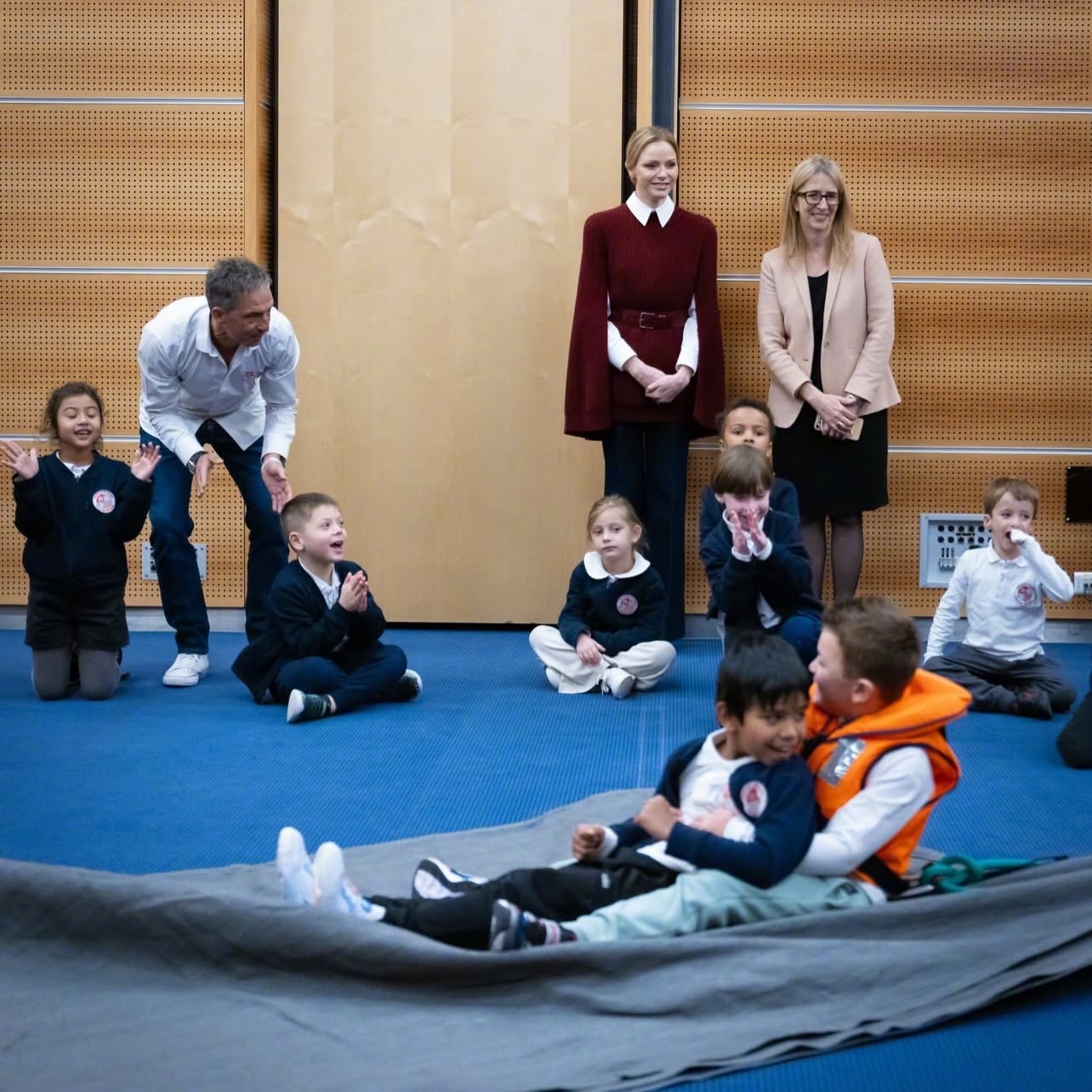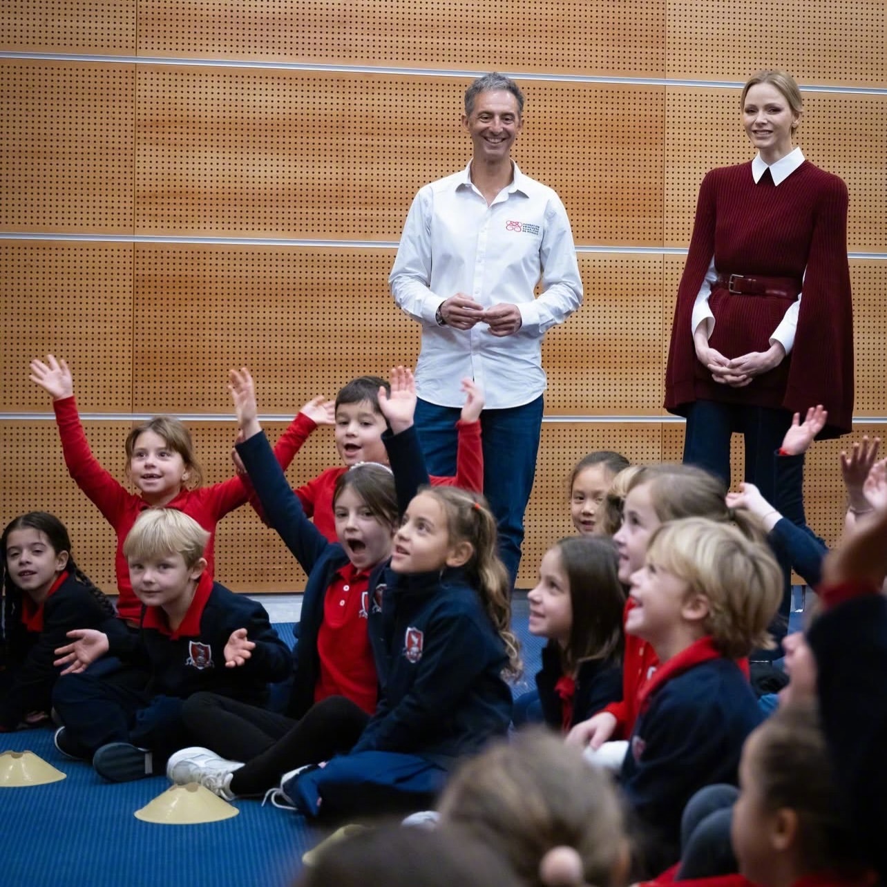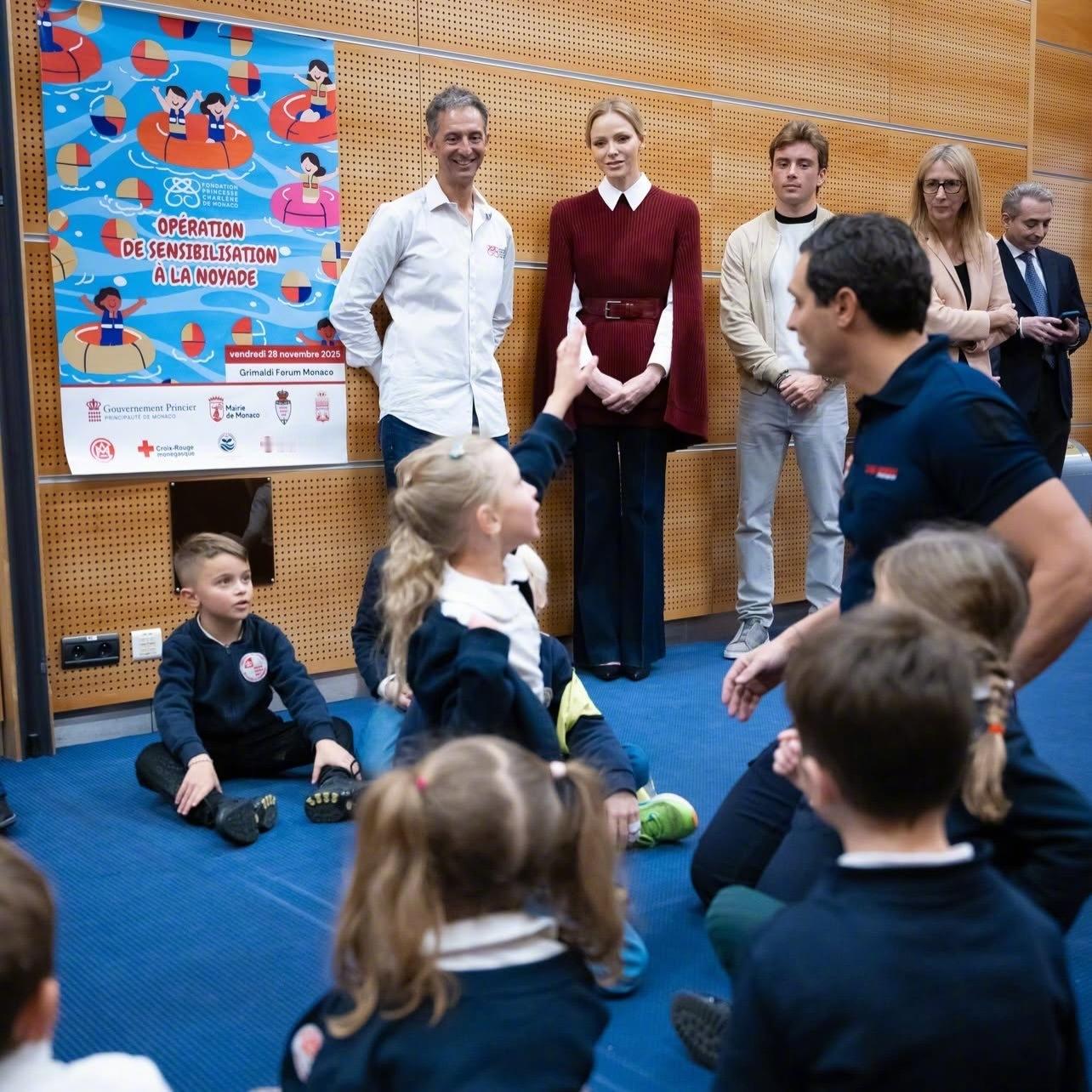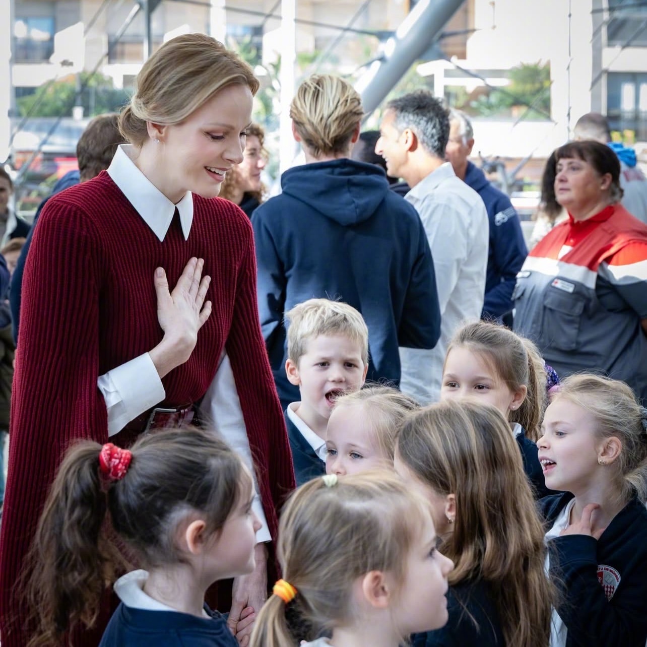 当地时间11月28日,摩纳哥夏琳王妃身穿Max Mara 覆盆子色斗篷连衣裙和腰