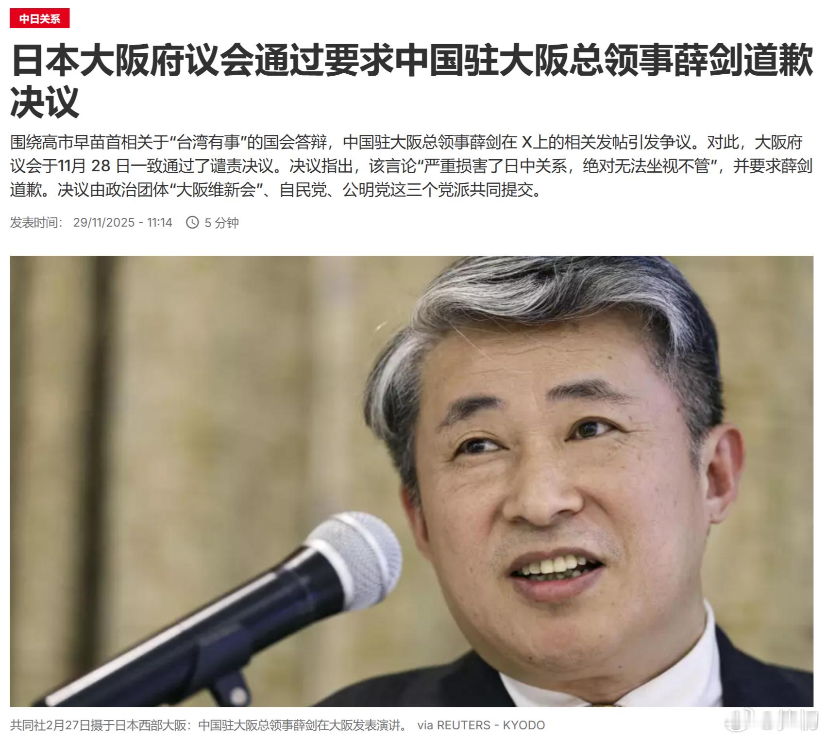 日本大阪府议会一致通过了谴责中国驻大阪总领事的决议指出,该言论“严重损害了日中关系,绝对无法坐视不管”,并要求薛剑道歉。你看,鬼子根本没再怕的。我觉得中国可以再上强度,限日令考虑一下。 限日令 日本歌手上海演唱时被中断演出