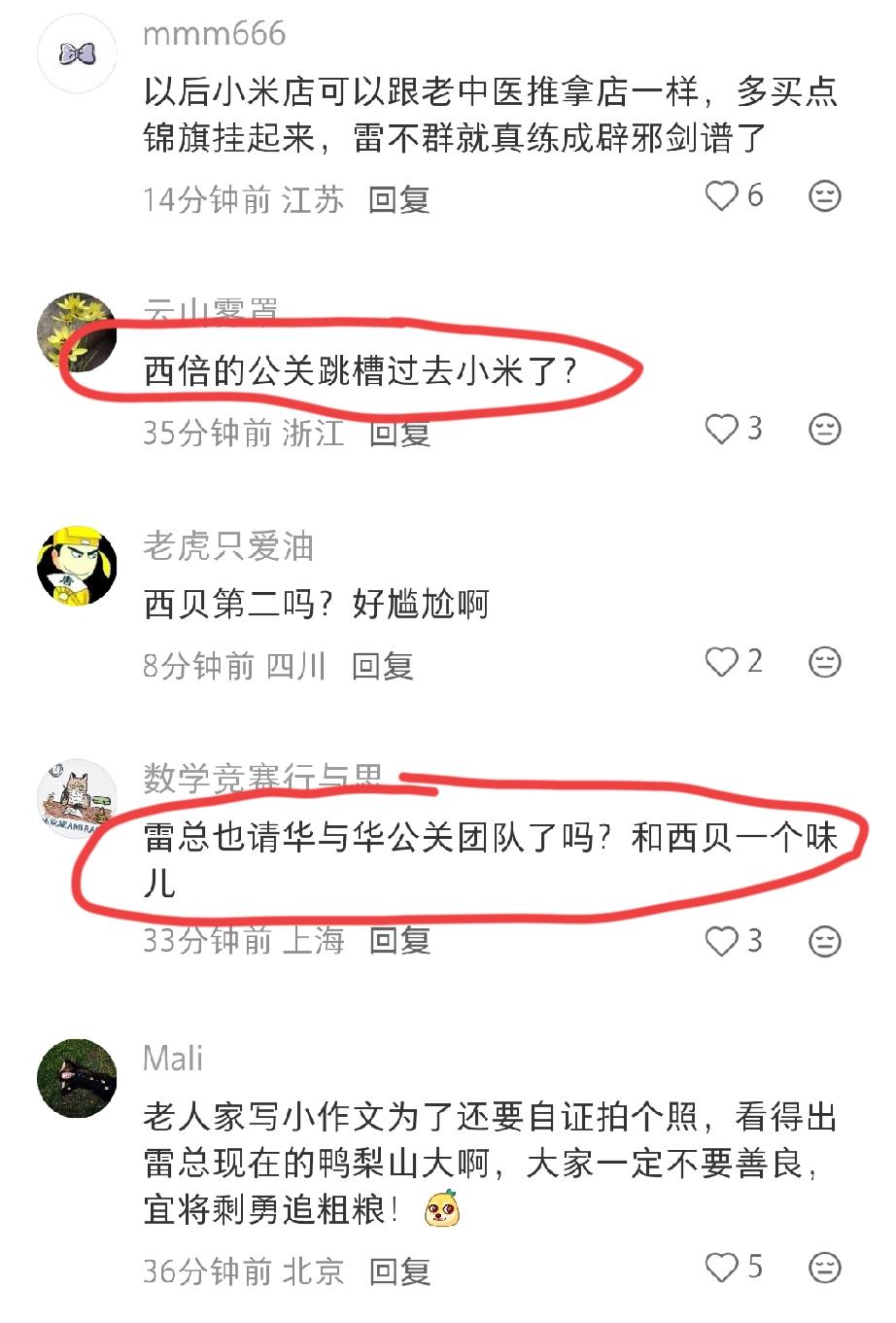 八十多岁老大爷写信夸赞小米之家及工作人员的服务态度好,雷总转发,并表示“看了信后,非常的感动”。 可评论区都是调侃揶揄的声音: “雷总也请华与华公关团队了吗?和西贝一个味儿”。 “华与华的营销手段和雷总的比,那是小巫见大巫,论营销这一块,雷总才是祖师爷,京东大强子的那句话的含金量还在不断上升”。 …… 咱也不懂,雷总就转发了一下人家的博文,有什么问题吗?