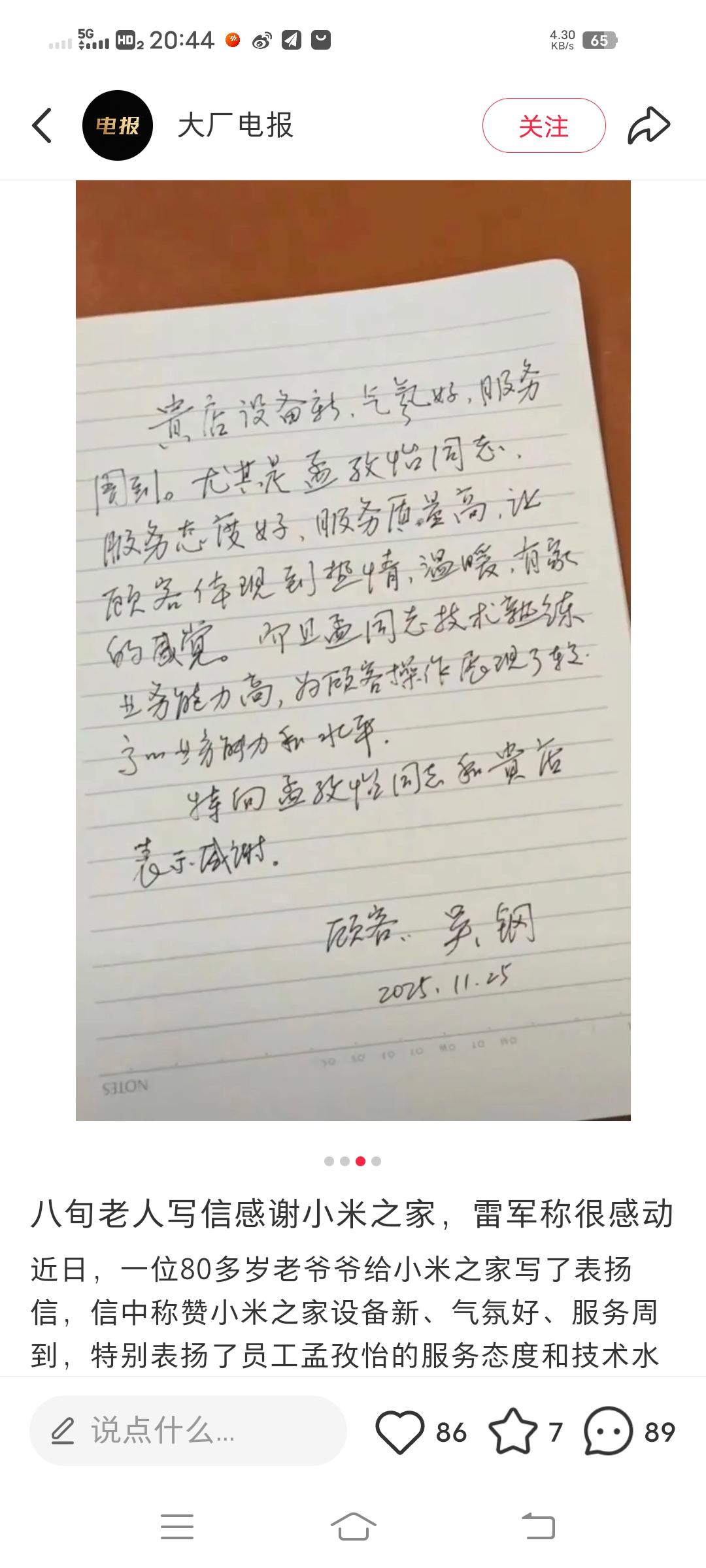 八十多岁老大爷写信夸赞小米之家及工作人员的服务态度好,雷总转发,并表示“看了信后