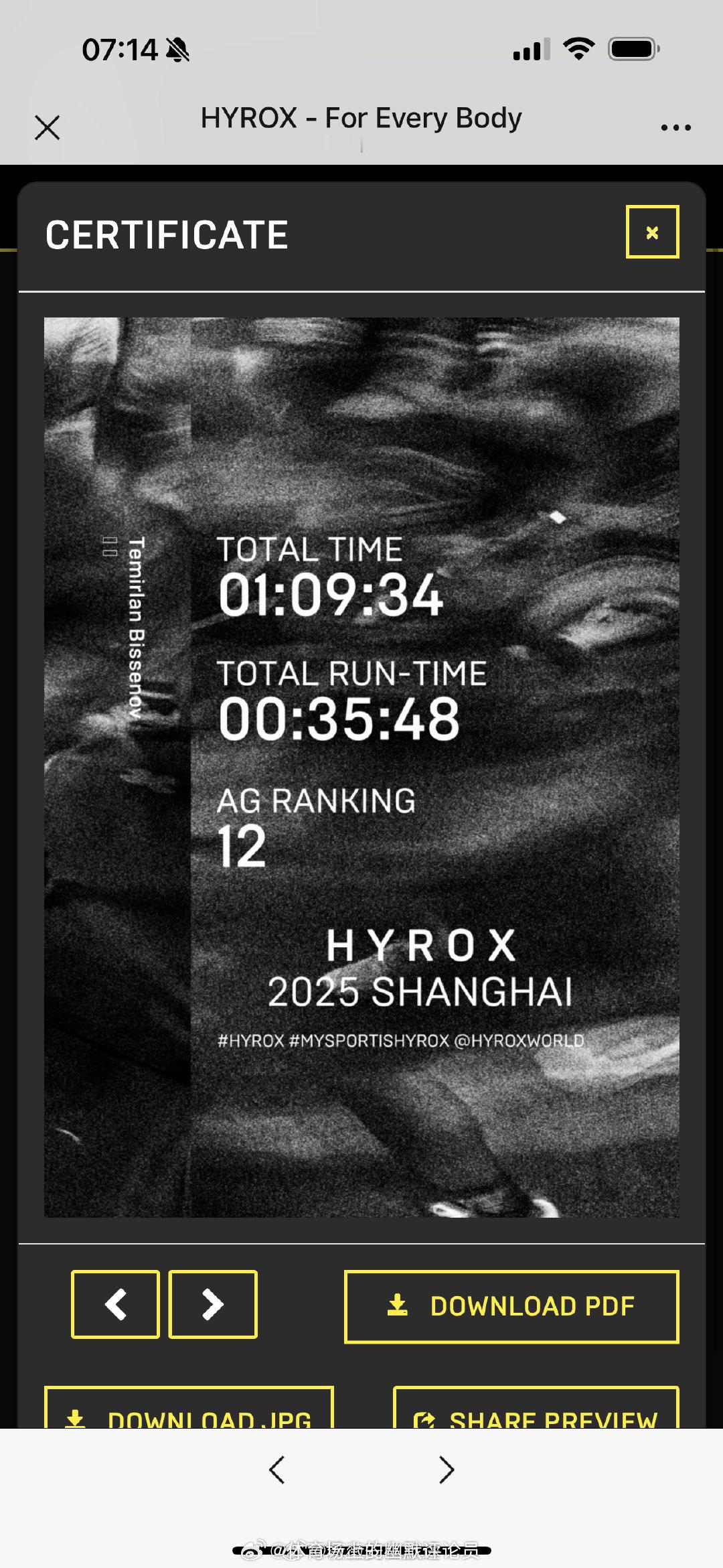 Sub 70 💖Finally made my first Hyrox!🥇人生第一场Hyrox✅🏆69分✅30年龄组第12✅🤝和搭档决定一起参加上海站混双后🏃♀️➡️开始了一个半月的训练🤔因为担心受伤,我也停了所有越野赛🏋️♀️这期间有间歇跑、LSD、力量和有氧训练🐶开始的每天都累疯了💪我在健身房几乎不上大重量,毕竟跑步和力量训练都是为了享受每一次越野跑🚶而我的搭档在跑步方面属于佛系跑在这一个半月的备赛时间里🔔他身体里的速度和心肺被激活了🤣🔨我也举得起扛得动了🤣可见运动能让你感知身体无极限🙃然而,赛前两周唯一一次模拟🛷因为地面太卡原本对大重量Push就没什么信心的我把腓肠肌拉伤了,但因为对疼痛比较钝感也是坚持完成了比赛🪨拉伤后的两天小腿肚子像两块坚硬的石头🏥接下来的一周三次康复和各种消炎止痛热敷用上了所有总算在比赛前感觉到腿是腿了😅1️⃣这是我们第一场Hyrox在这之前我们都没有参加过个人赛🚩目标是75分钟,争取不犯规罚时赛中从Pull我被警告突然就忘了数次数,多拉了12米再到波比跑向第二道开始后又被要求回到第一道重新跳到后来的墙球不停no rep🤣可以说是经历了所有💖也开心完成目标🎯夸夸Nike服务站的小哥哥小姐姐们,造型、拍照、恢复、补给,全方位的支持实在是被暖到了🥰下站见啦()