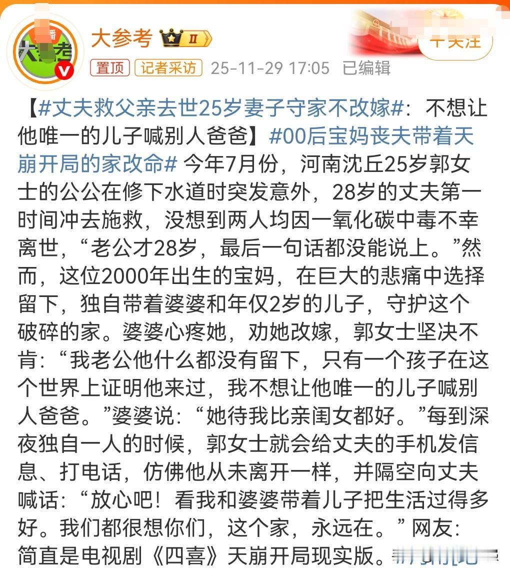 这真的是太悲剧了。 今年7月份,丈夫救父亲去世,25岁妻子守家不改嫁。 婆婆心疼她,要她改嫁,她说不想让孩子叫别的人爸爸。 难道就因为这样不嫁人了? 哪怕不想让孩子叫别人叫爸爸,也可以让孩子叫对方叔叔啊。 这一辈子这么长,这么年轻,不结婚挺可惜的。