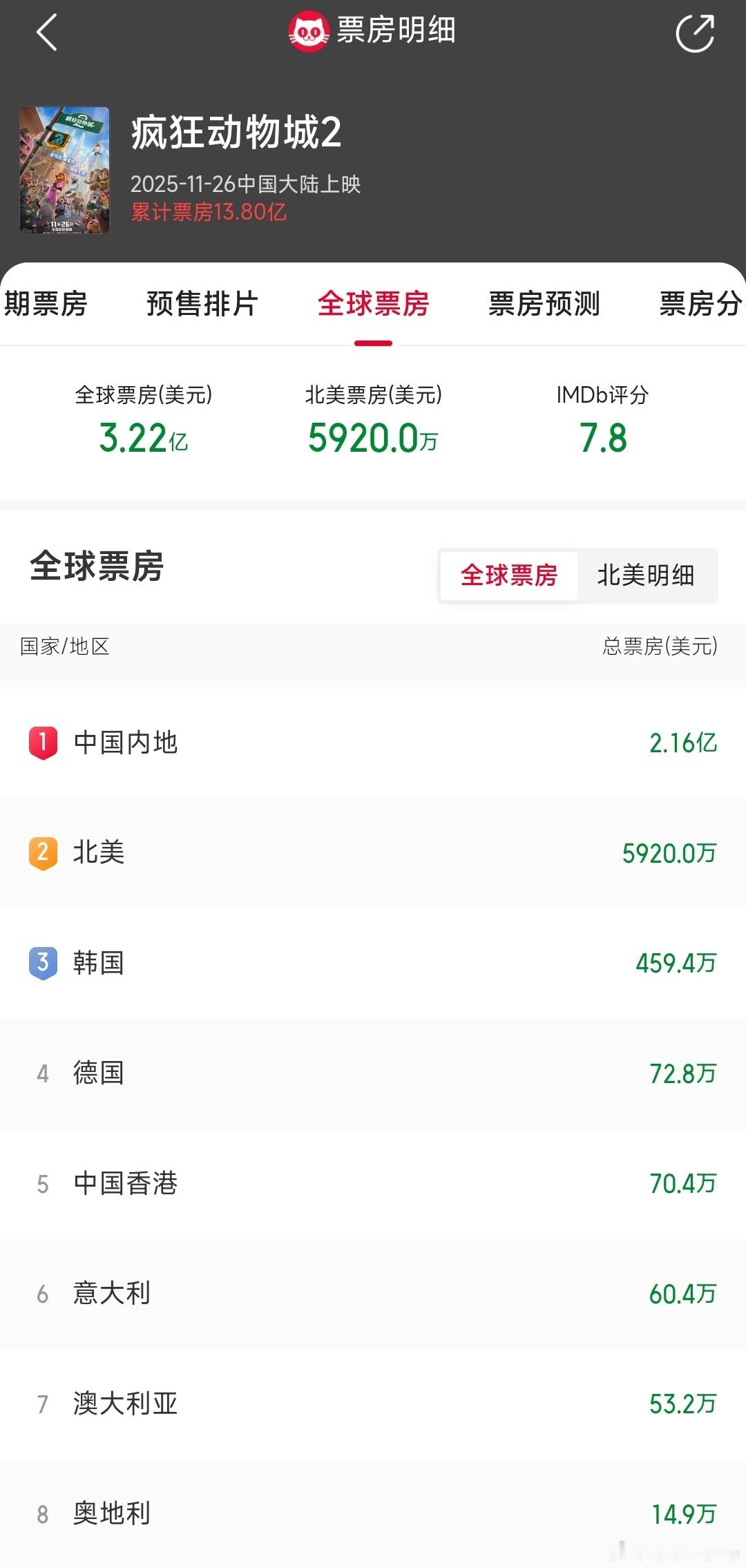疯狂动物城刚刚上映第四天,已经进去全球票房年榜单前30。目前很多国家还没上映