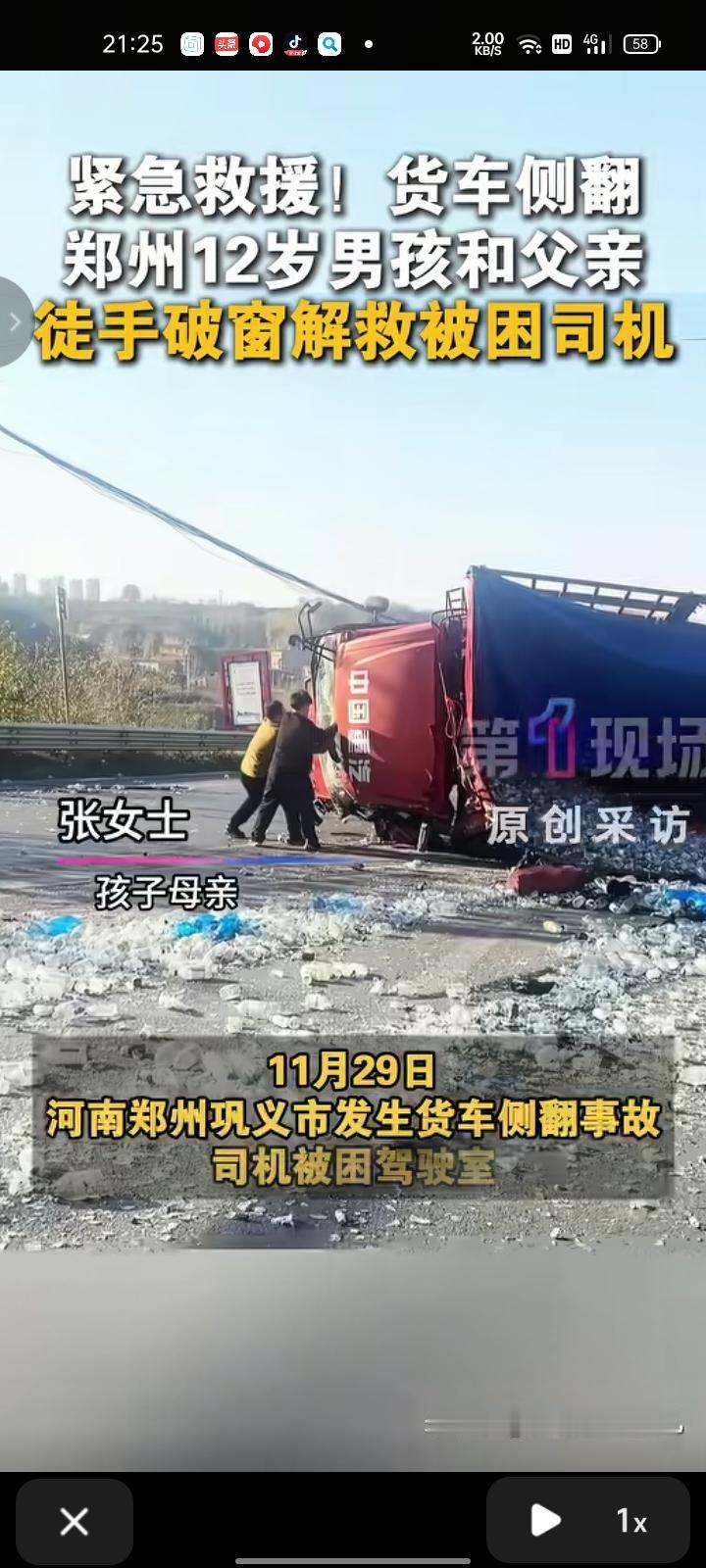 11月29日,郑州巩义市。货车在高速路侧翻,司机被困驾驶室。危急时刻,一位爸爸带着12岁儿子毫不犹豫冲上前,徒手掰窗施救。 孩子妈妈张女士称,已拨打120,孩子这种正义感和勇敢让自己做妈妈的听新闻,但还是忍不住会担心。