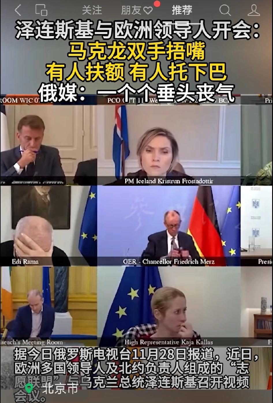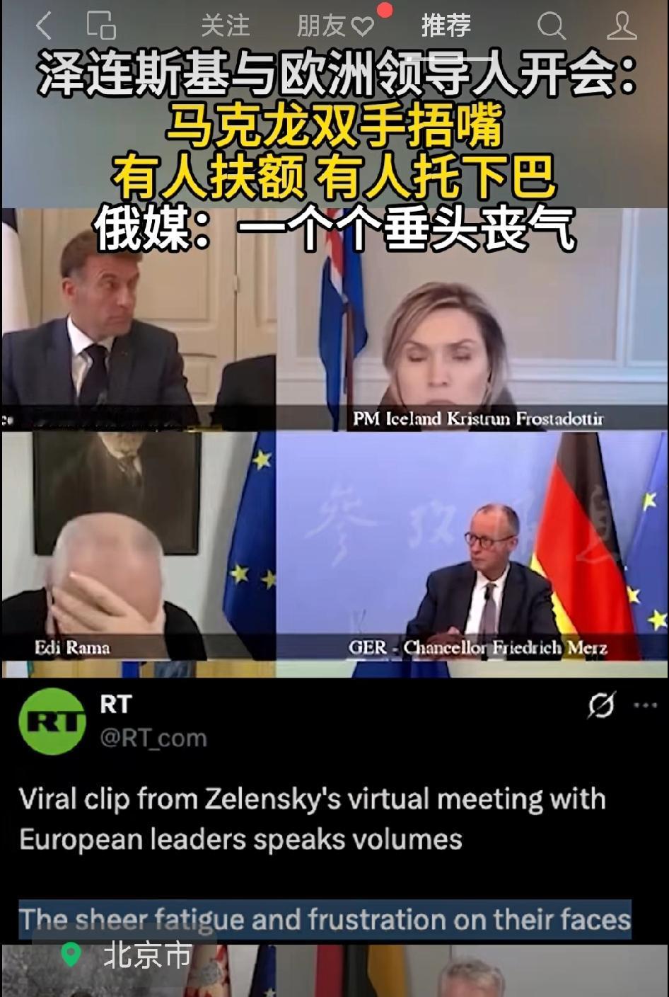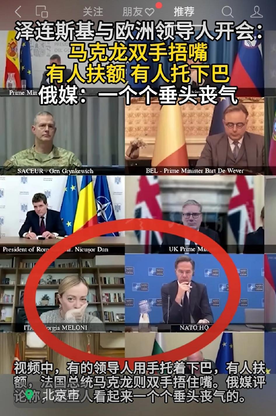 “泽连斯基与欧洲领导人开会”每个人的动作就说明了问题 马克龙双手捂嘴! 有人扶额头! 有人托下巴! 俄媒:一个个垂头丧气! 大家怎么看呢?