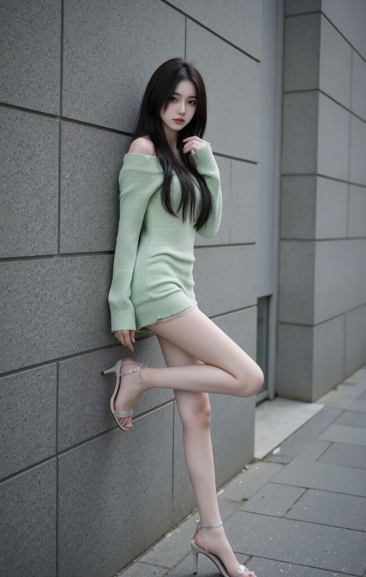 浅绿针织裹着松弛的温柔,鞋跟轻叩墙面时,风都慢了半拍。