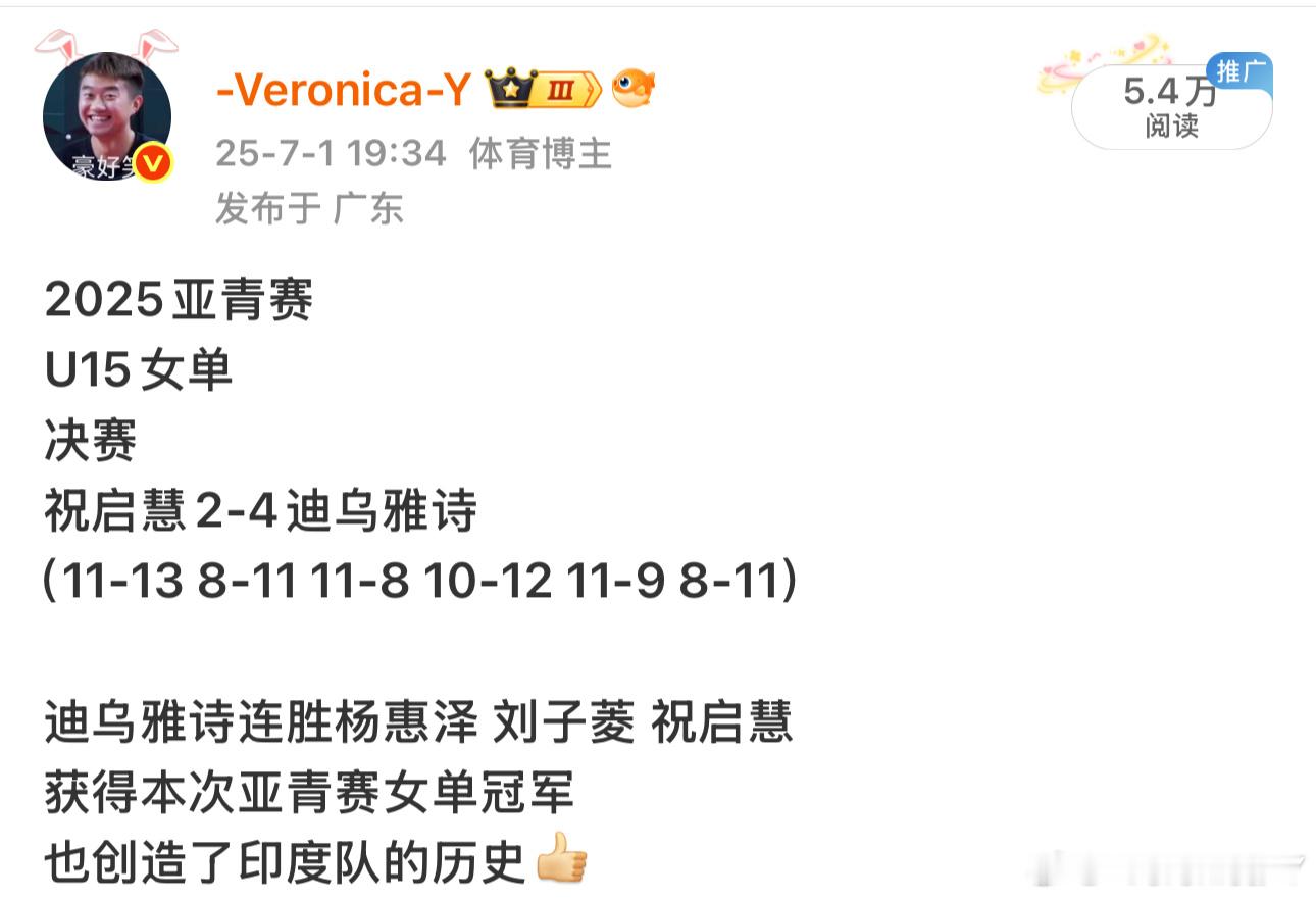 2025世青赛U15女单8-4迪乌扬诗4-2石田心美4-2迪乌扬诗VS祝启慧村松心菜VS坂垣心春前情提要:迪乌扬诗在亚青赛一串三战胜杨惠泽刘子菱 祝启慧 成为U15女单冠军