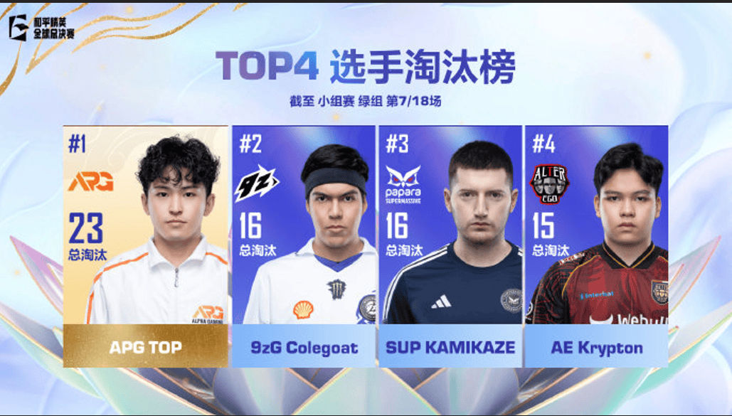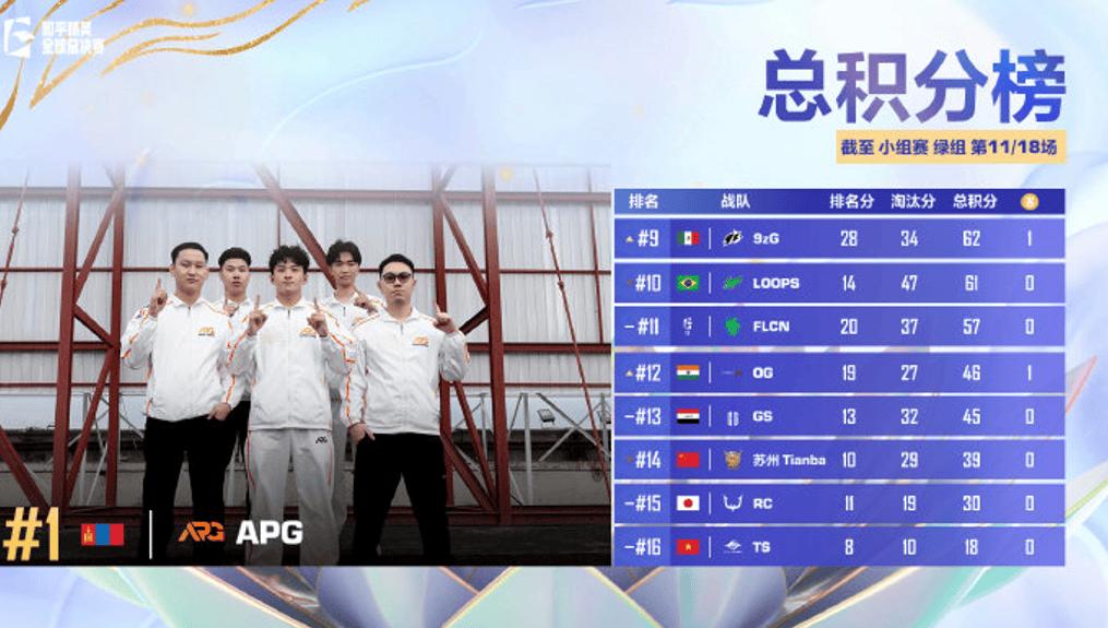 落地不久Tianba收下OG战队两人拿下两个积分,与此同时IC爆炸开局四个人全被FLCN收下,无法复活率先出局。决胜时刻,信号圈缩在龙城附近,圈内剩余WOL战队、GS战队和GEN战队,此时场上2v1v4。GEN战队与WOL战队均出现倒人,WOL战队先被淘汰,随后剩余两队展开对战,GEN战队二打一淘汰GS战队独狼拿下比赛,恭EN战队获得本场比赛胜利。
