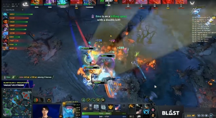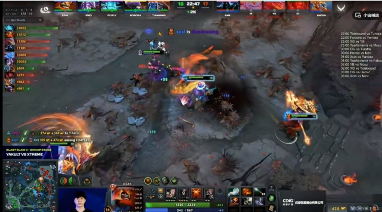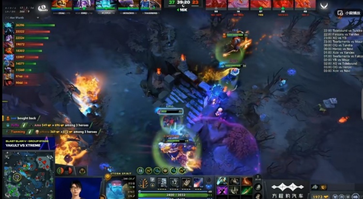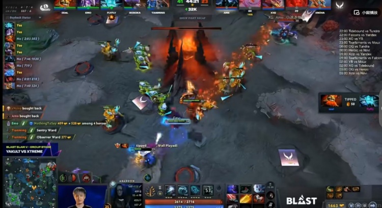 [30分钟]中路团战双方互换酱油,随后无解肥的flyfly蓝猫带队追击XG根本拦不住,zeal马尔斯框大留人,这波XG又被击杀四人,YB趁势直接拆掉中二塔上高,XG强行反打但是flyfly蓝猫开着BKB冲锋切人根本挡不住啊!高地团YB又是1换2,回头拿下魔晶,经济差已经12K了!