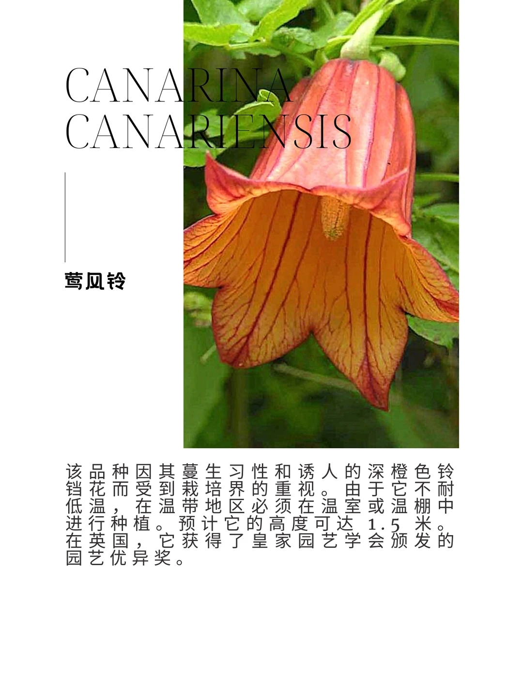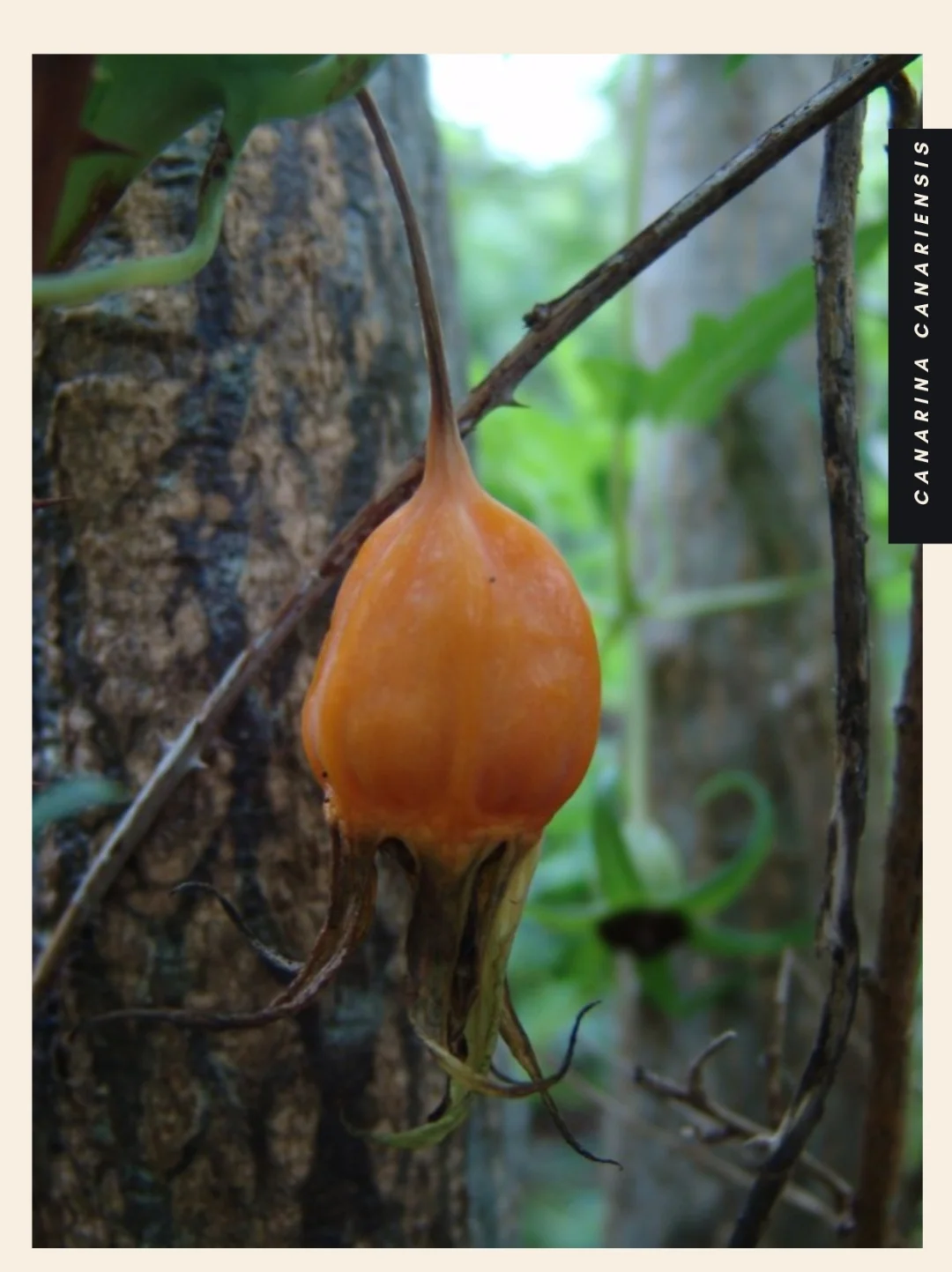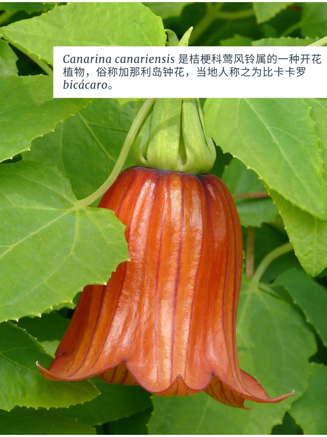 j花园植物 藤本植物 莺风铃 Canarina canariensis 桔梗科 加纳利 浆果 可食用 食用浆果 莺风铃Canarina canariensis,是桔梗科莺风铃属的一种开花植物,俗称加那利岛钟花,当地人称之为比卡卡罗bicácaro。