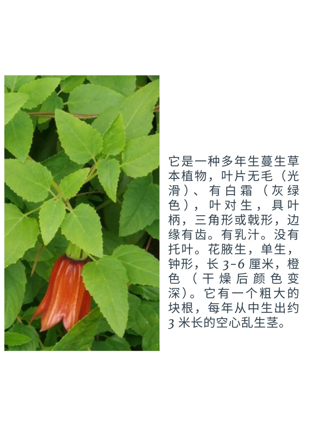 它是一种多年生蔓生草本植物,叶片无毛(光滑)、有白霜(灰绿色),叶对生,具叶柄,三角形或戟形,边缘有齿。有乳汁。没有托叶。花腋生,单生,钟形,长 3-6 厘米,橙色(干燥后颜色变深)。它有一个粗大的块根,每年从中生出约 3 米长的空心乱生茎。