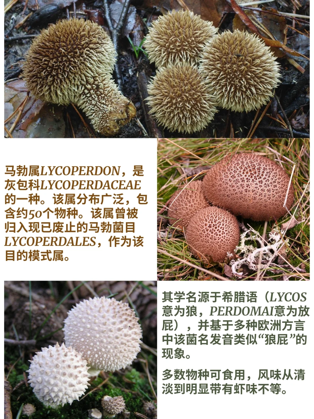 真菌 灰包科 马勃属 Lycoperdon 可食用真菌 食用菌菇 食用菌 马勃属Lycoperdon,是灰包科Lycoperdaceae的一种。该属分布广泛,包含约50个物种。通常涵盖较小型物种。该属曾被归入现已废止的马勃菌目Lycoperdales,作为该目的模式属。其学名源于希腊语(lycos意为狼,perdomai意为放屁),并基于多种欧洲方言中该菌名发音类似“狼屁”的现象。 多数物种可食用,风味从清淡到明显带有虾味不等。
