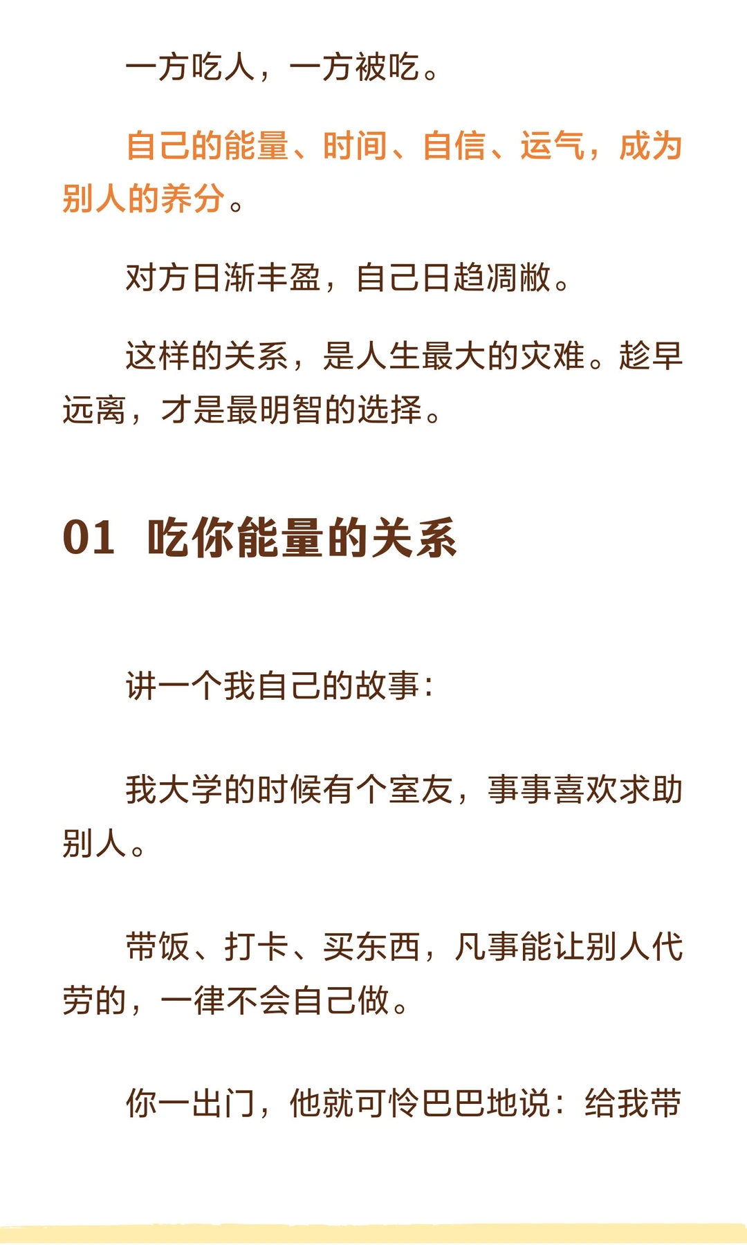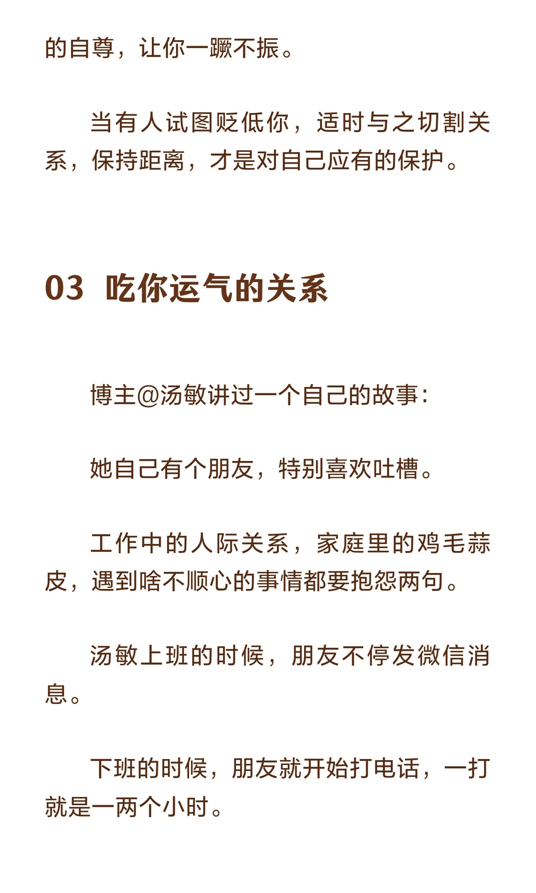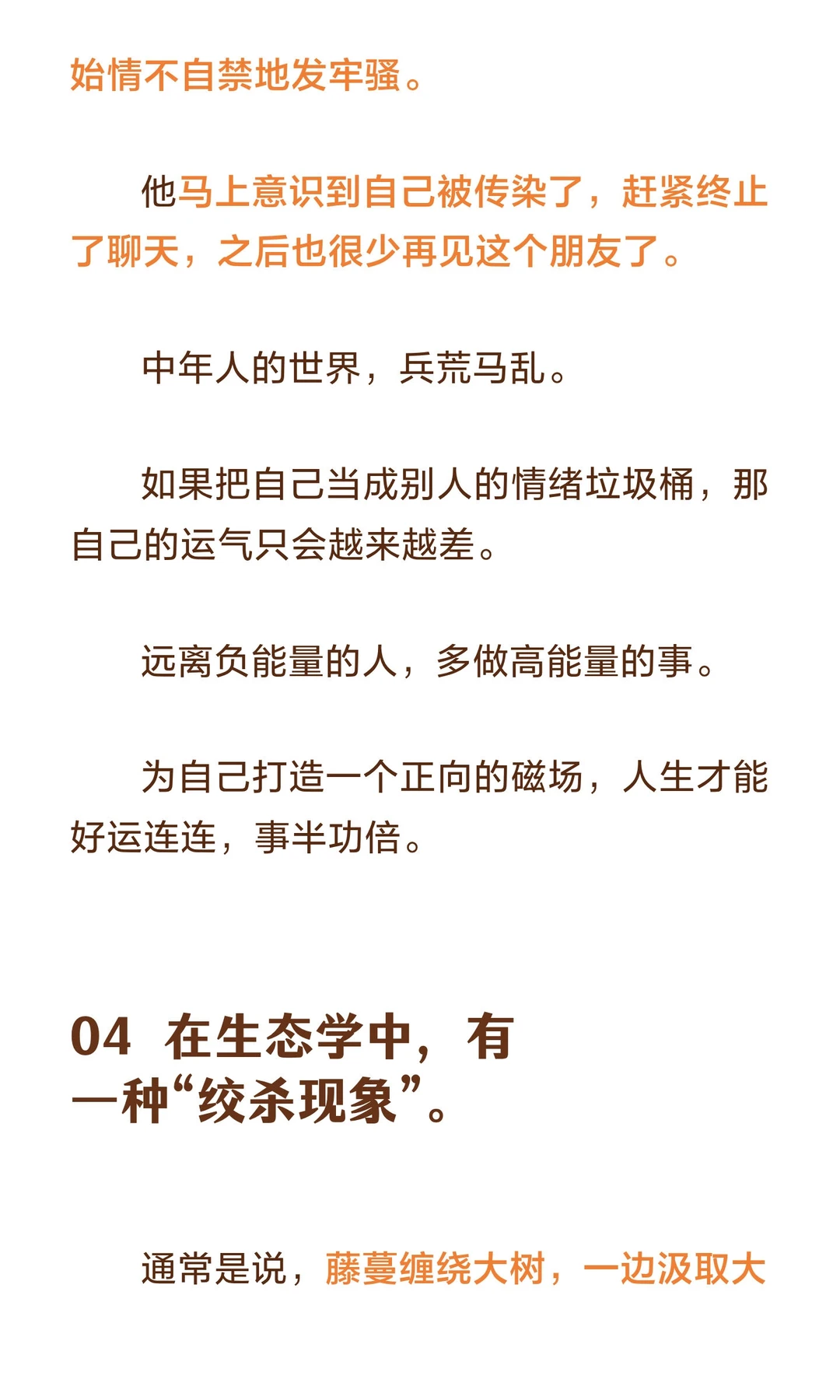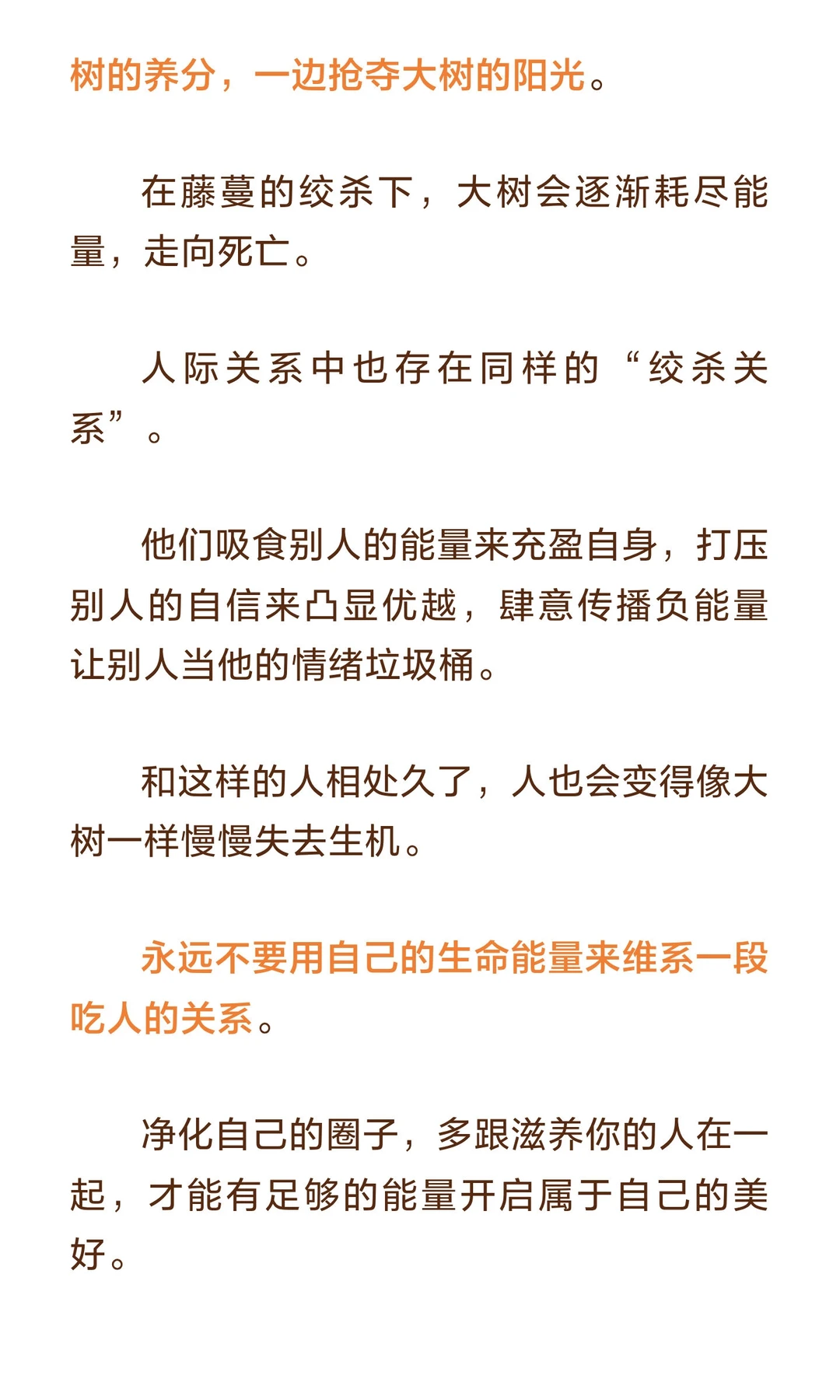 避免与消耗你能量、自信和运气的人为伍,远离负能量和打压,才能保持自我成长和积极心态。 作家水木丁说: 人和人之间的关系并不是只有温暖和爱,有时候会有力量的角逐和博弈,有时候甚至是一种吃人的关系。 一方吃人,一方被吃。 自己的能量、时间、自信、运气,成为别人的养分。 对方日渐丰盈,自己日趋凋敝。 这样的关系,是人生最大的灾难。趁早远离,才是最明智的选择。
