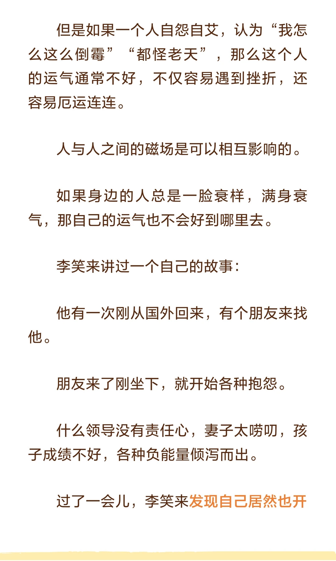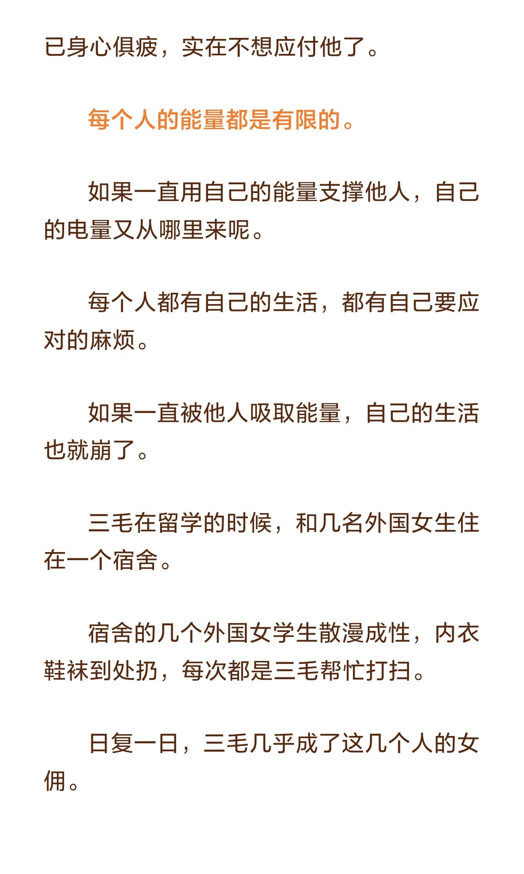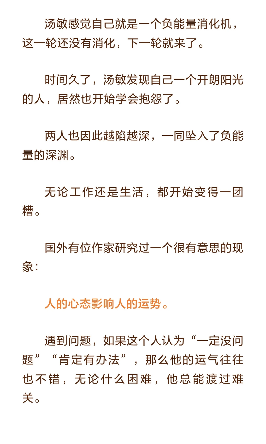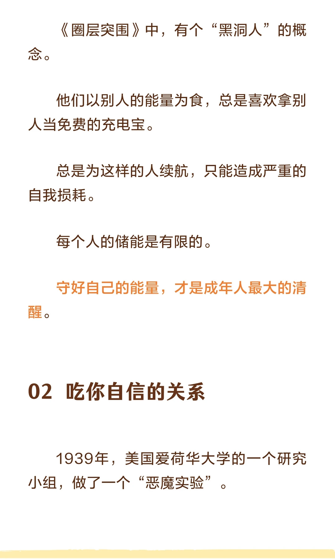 避免与消耗你能量、自信和运气的人为伍,远离负能量和打压,才能保持自我成长和积极心态。 作家水木丁说: 人和人之间的关系并不是只有温暖和爱,有时候会有力量的角逐和博弈,有时候甚至是一种吃人的关系。 一方吃人,一方被吃。 自己的能量、时间、自信、运气,成为别人的养分。 对方日渐丰盈,自己日趋凋敝。 这样的关系,是人生最大的灾难。趁早远离,才是最明智的选择。