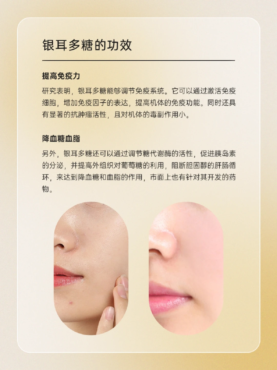 💛银耳多糖是什么 💛银耳多糖的功效 · 提高免yi力 · 降血糖血脂 · 保湿锁水 · 修护屏障 · 抗氧抗老 💛银耳多糖的应用 一起来了解一下吧,下期还想看什么可以️❤️+🍎告诉我哦