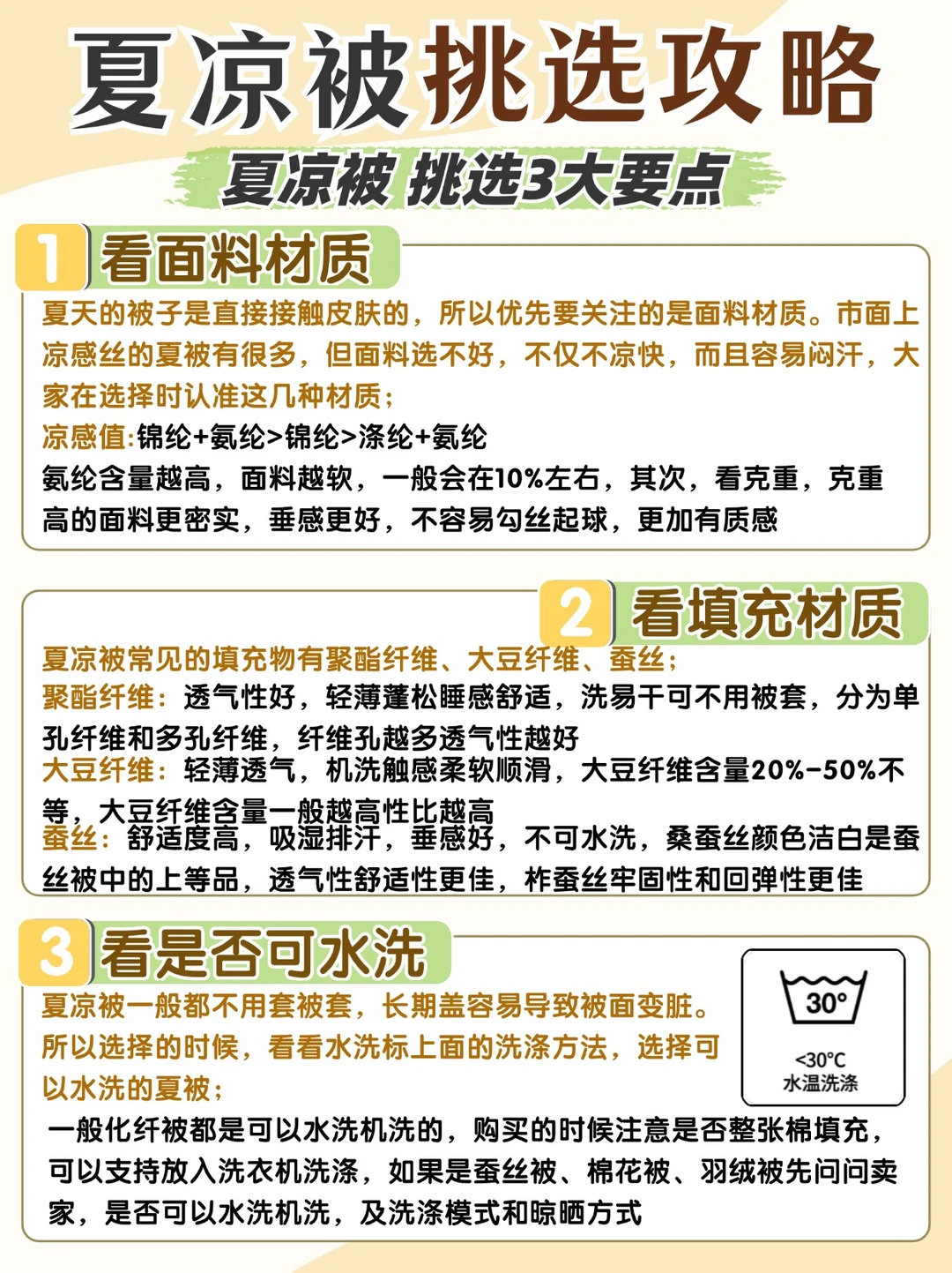 夏天的被子是直接接触皮肤的,所以优先要关注的是面料材质。市面上凉感丝的夏被有很多,但面料选不好,不仅不凉快,而且容易闷汗,大家在选择时认准这几种材质;