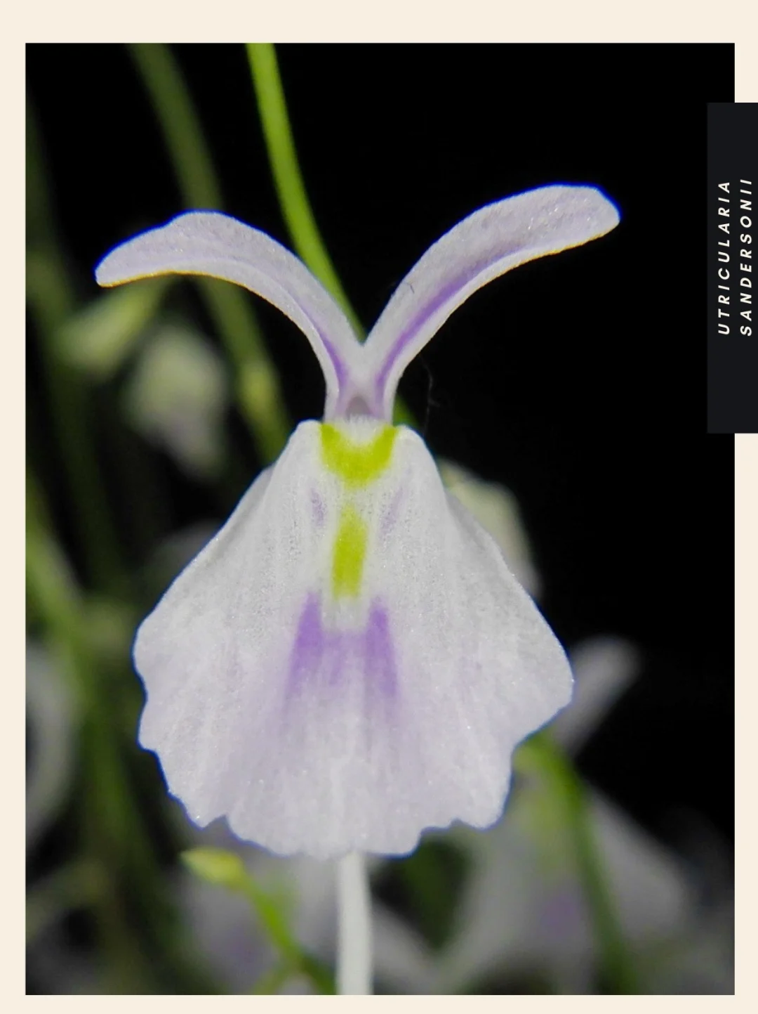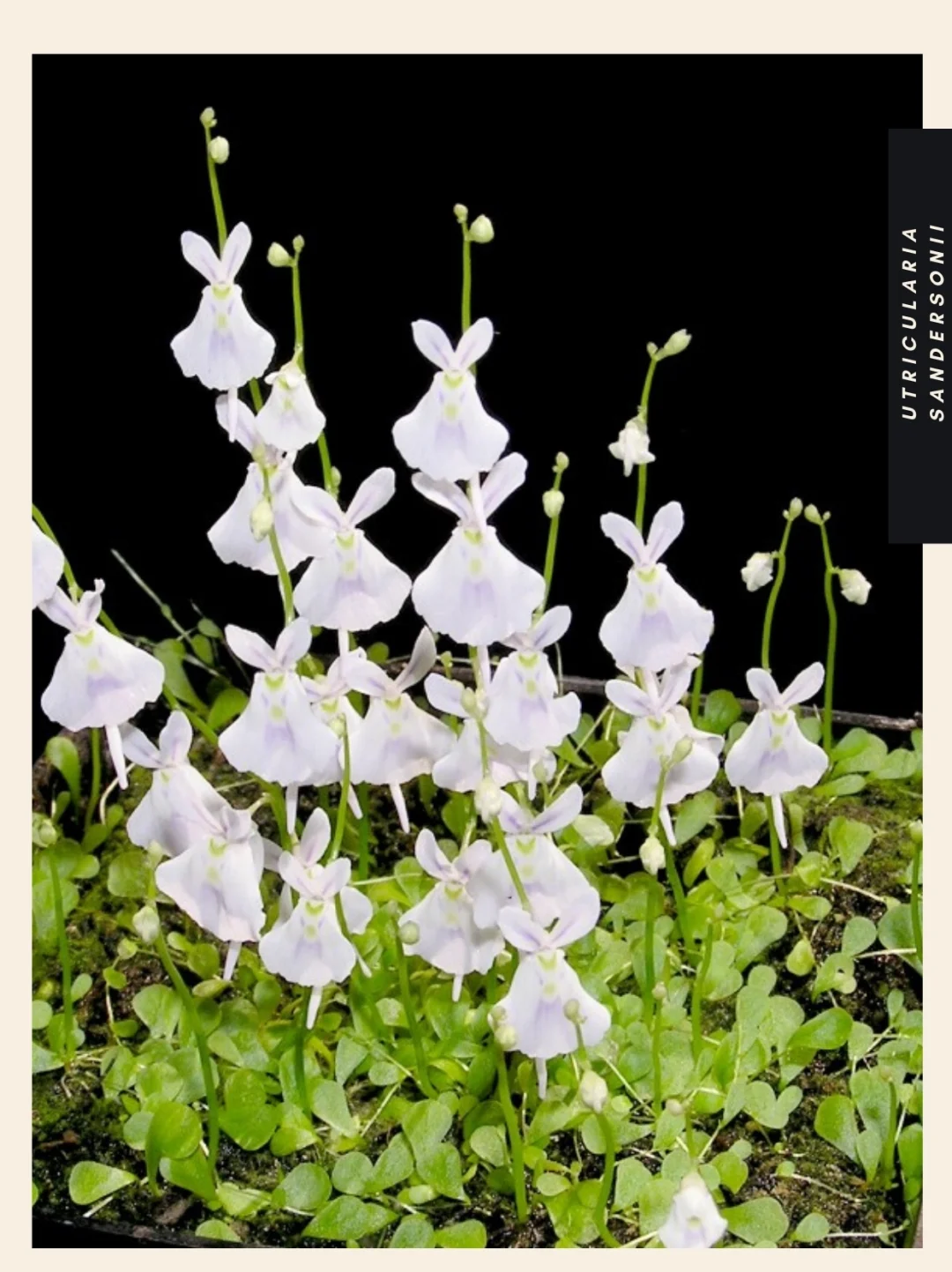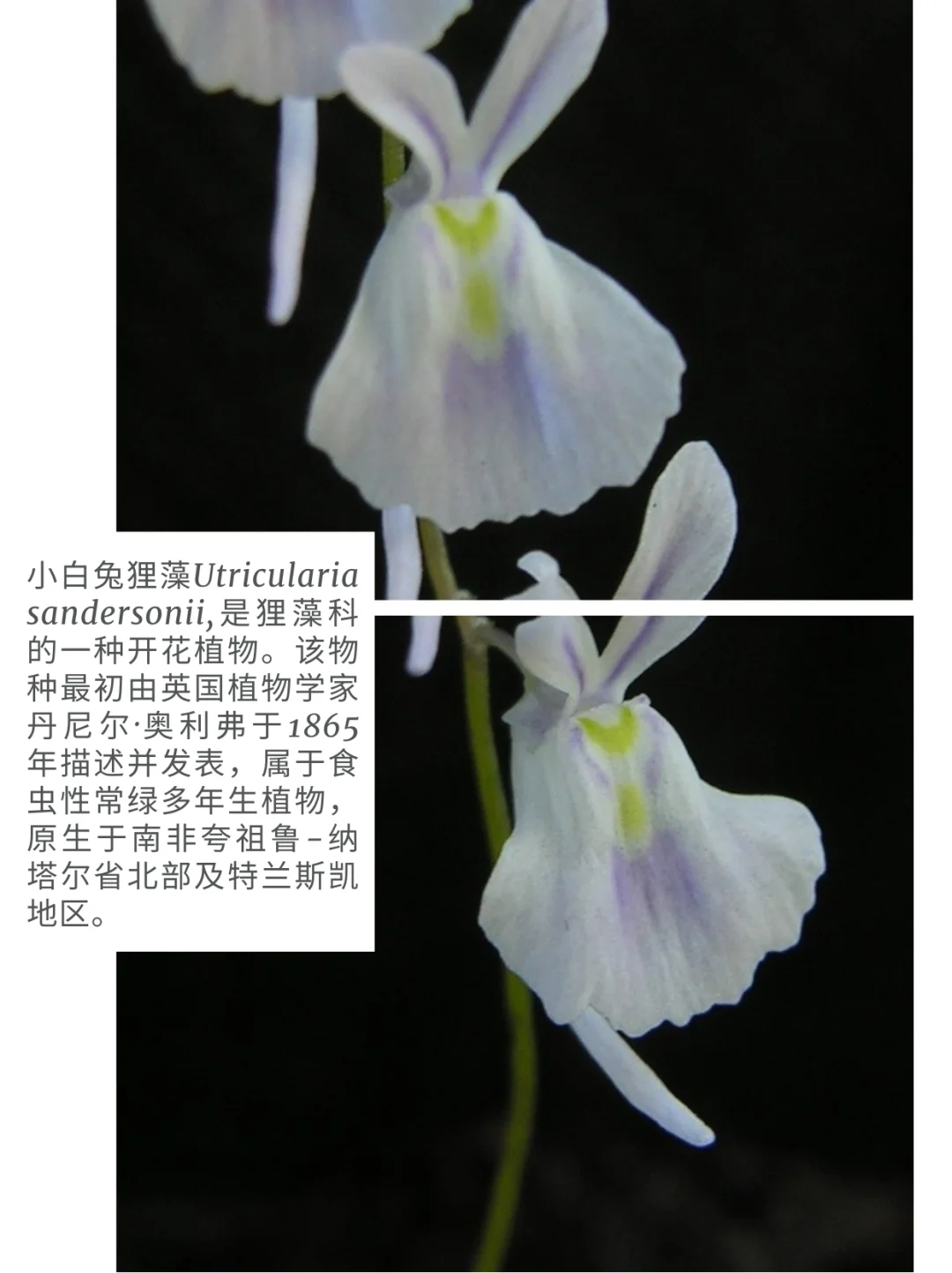 食虫植物 小白兔狸藻 狸藻科 狸藻属 Utricularia sandersonii 开花植物 盆栽 英国皇家园艺学会 AGM 多年生植物 小白兔狸藻Utricularia sandersonii,是狸藻科狸藻属的一种开花植物。该物种最初由英国植物学家丹尼尔·奥利弗于1865年描述并发表,属于食虫性常绿多年生植物,原生于南非夸祖鲁-纳塔尔省北部及特兰斯凯地区。