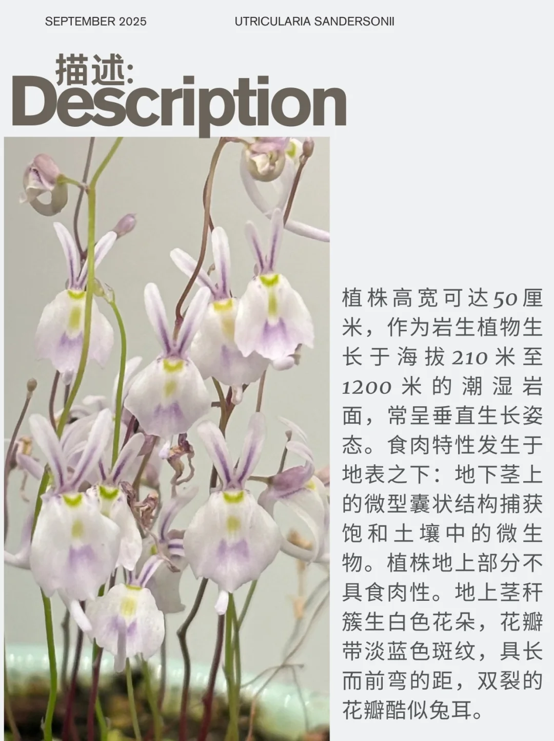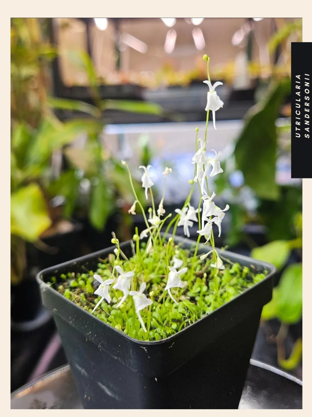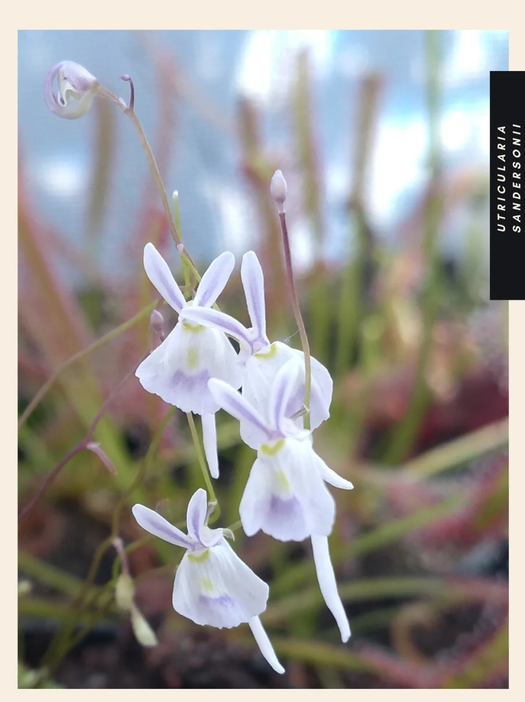 食虫植物 小白兔狸藻 狸藻科 狸藻属 Utricularia sandersonii 开花植物 盆栽 英国皇家园艺学会 AGM 多年生植物 小白兔狸藻Utricularia sandersonii,是狸藻科狸藻属的一种开花植物。该物种最初由英国植物学家丹尼尔·奥利弗于1865年描述并发表,属于食虫性常绿多年生植物,原生于南非夸祖鲁-纳塔尔省北部及特兰斯凯地区。