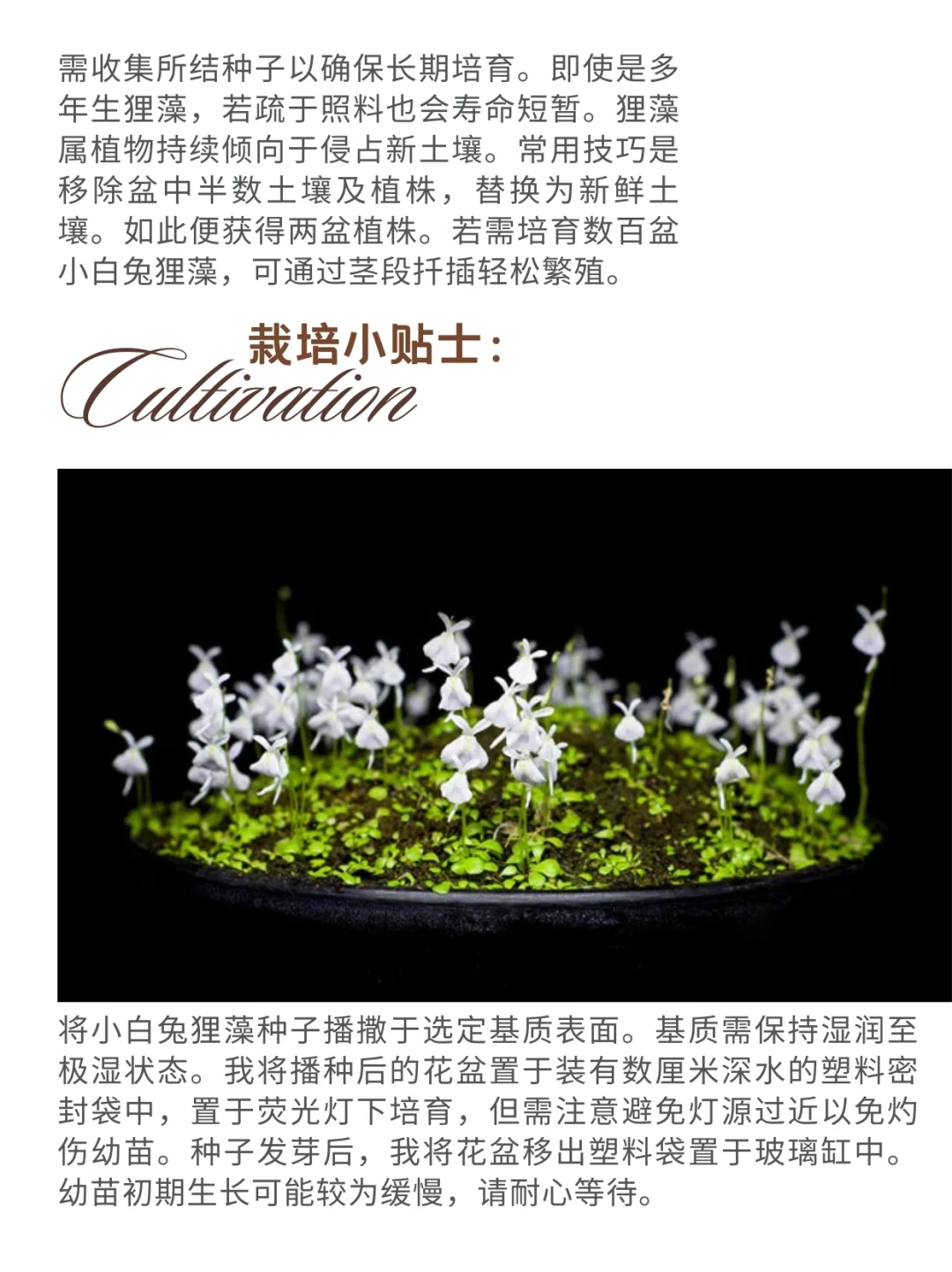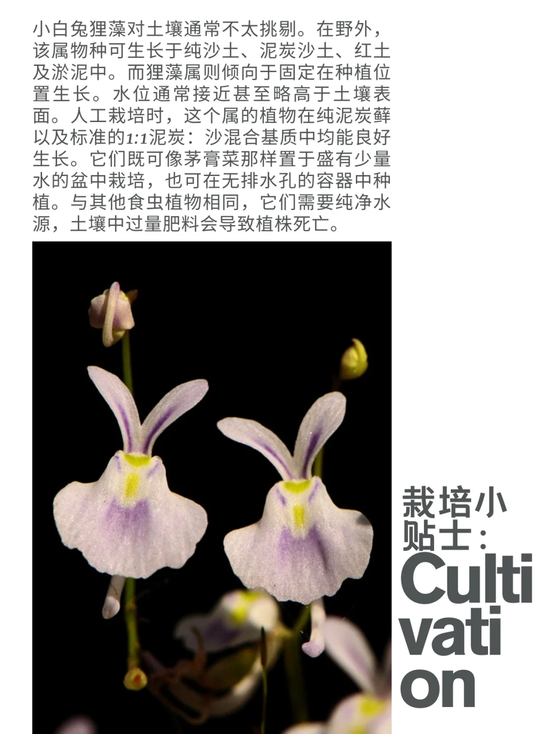 小白兔狸藻对土壤通常不太挑剔。在野外,该属物种可生长于纯沙土、泥炭沙土、红土及淤泥中。而狸藻属则倾向于固定在种植位置生长。水位通常接近甚至略高于土壤表面。人工栽培时,这个属的植物在纯泥炭藓以及标准的1:1泥炭:沙混合基质中均能良好生长。它们既可像茅膏菜那样置于盛有少量水的盆中栽培,也可在无排水孔的容器中种植。与其他食虫植物相同,它们需要纯净水源,土壤中过量肥料会导致植株死亡。