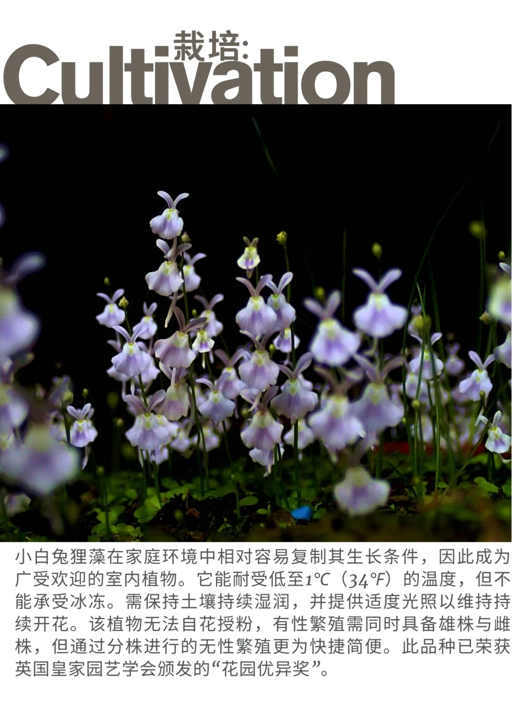植株高宽可达50厘米,作为岩生植物生长于海拔210米至1200米的潮湿岩面,常呈垂直生长姿态。食肉特性发生于地表之下:地下茎上的微型囊状结构捕获饱和土壤中的微生物。植株地上部分不具食肉性。地上茎秆簇生白色花朵,花瓣带淡蓝色斑纹,具长而前弯的距,双裂的花瓣酷似兔耳。