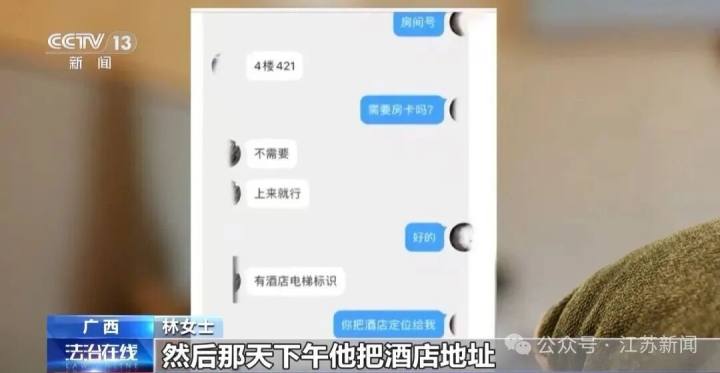 林女士:他就突然问我说哪一天你有没有空,我们约个下午时间,我说可以,然后那天下午他把酒店地址跟房号发给我了,我说你姓什么,然后他就跟我说他姓黄,我就打了这个酒店电话过去,确保他入住了。