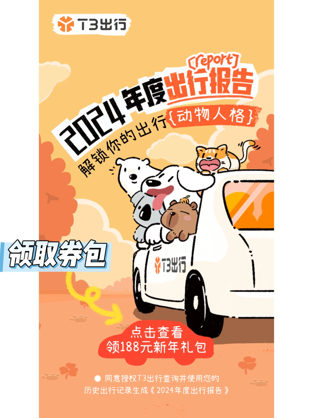 如果是T3的老用户,直接在T3出行的APP或者小程序就可以查看(首页下方->测测你的出行动物人格banner),设计风格这叫一个可可爱爱❤️