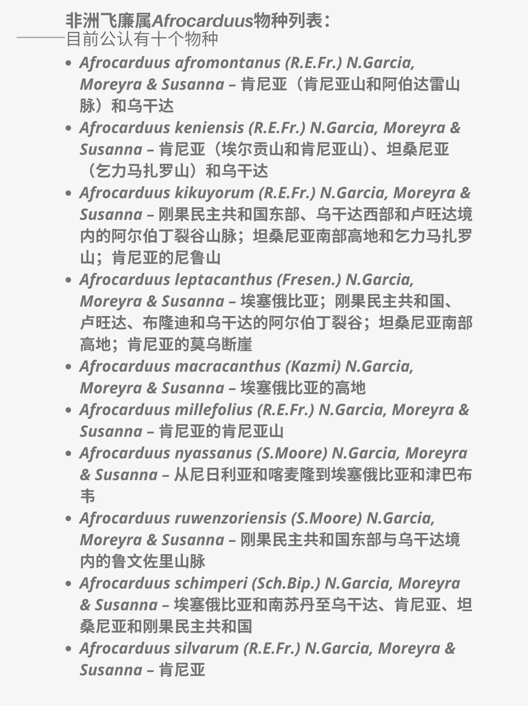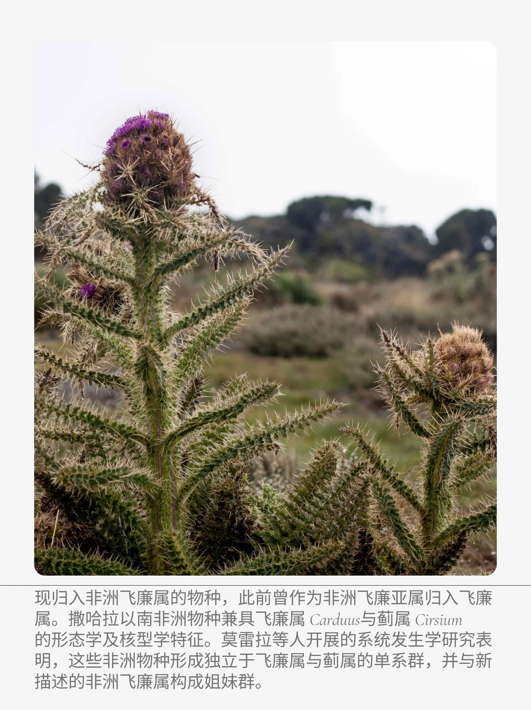 现归入非洲飞廉属的物种,此前曾作为非洲飞廉亚属归入飞廉属。撒哈拉以南非洲物种兼具飞廉属 Carduus与蓟属 Cirsium的形态学及核型学特征。莫雷拉等人开展的系统发生学研究表明,这些非洲物种形成独立于飞廉属与蓟属的单系群,并与新描述的非洲飞廉属构成姐妹群。