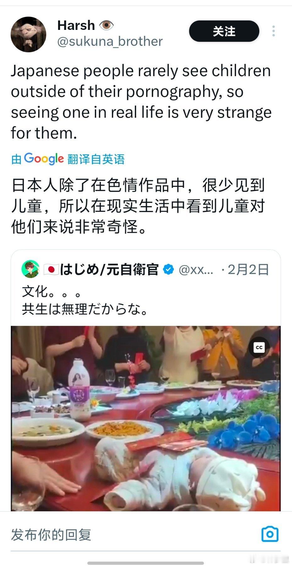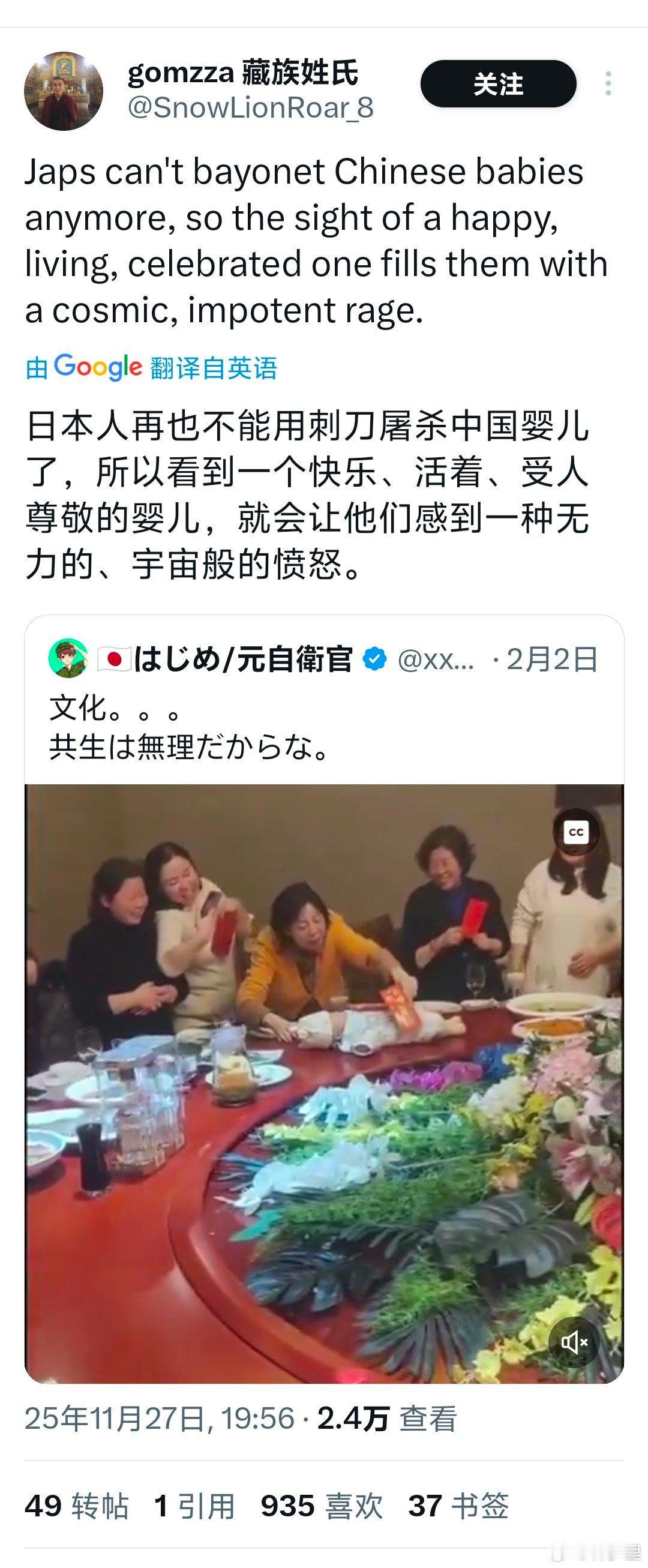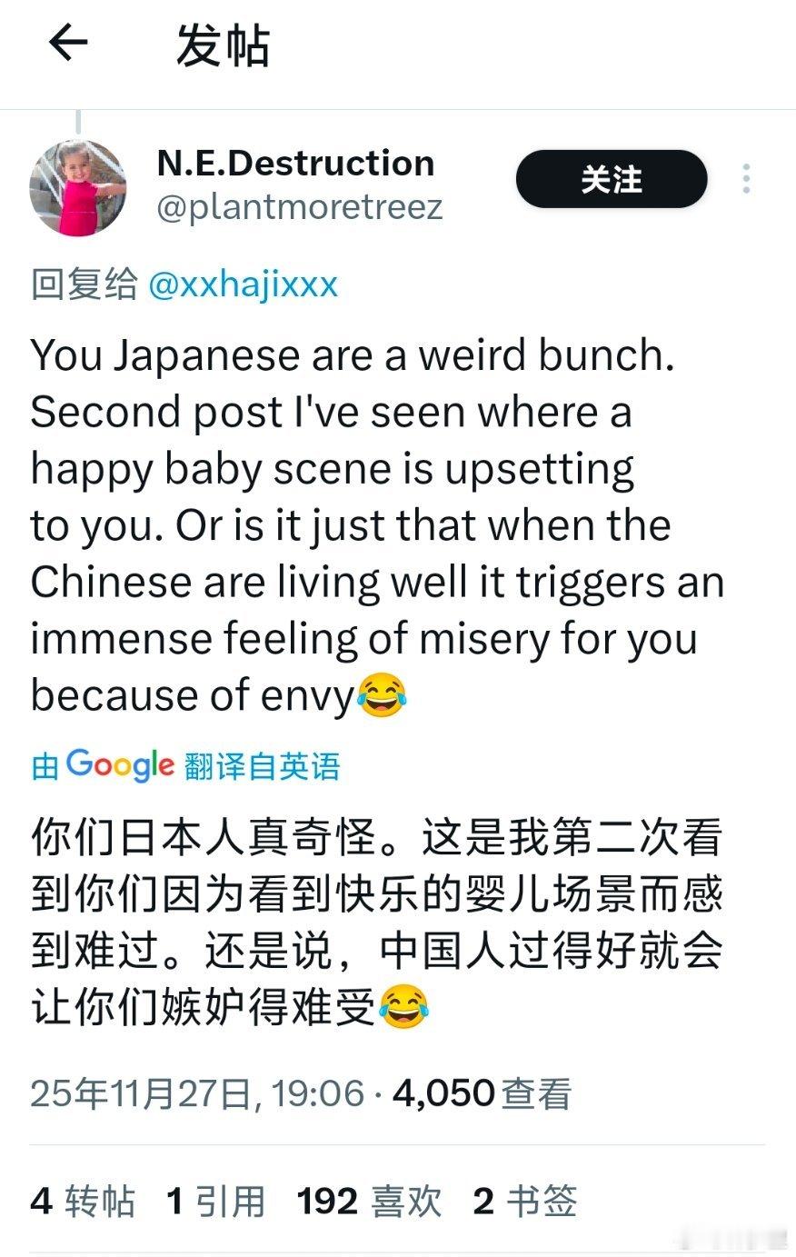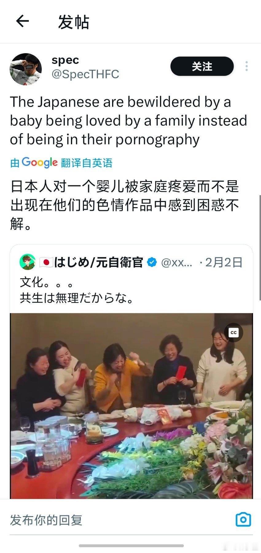 日网友恶评中国婴儿惊呆外网我去围观了一圈。其他国家或地区的人,都知道这是家庭温馨的场面,只有打日语的日本人表示不解。可见日本人的思维有脱离正常人类的部分,阴暗至极。