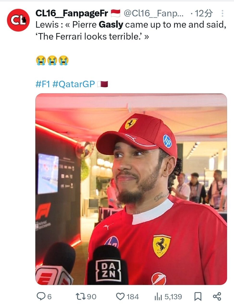 “虾仁猪心” 加斯利走过来告诉汉密尔顿:你们的法拉利看起来糟透了F1赛车2025F1卡塔尔大奖赛