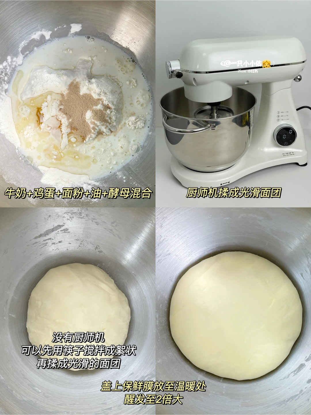 1⃣️牛奶+鸡蛋+面粉+油+酵母混合,用筷子搅拌成絮状,揉成光滑的面团;