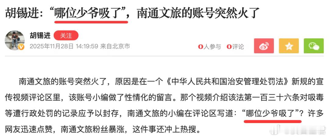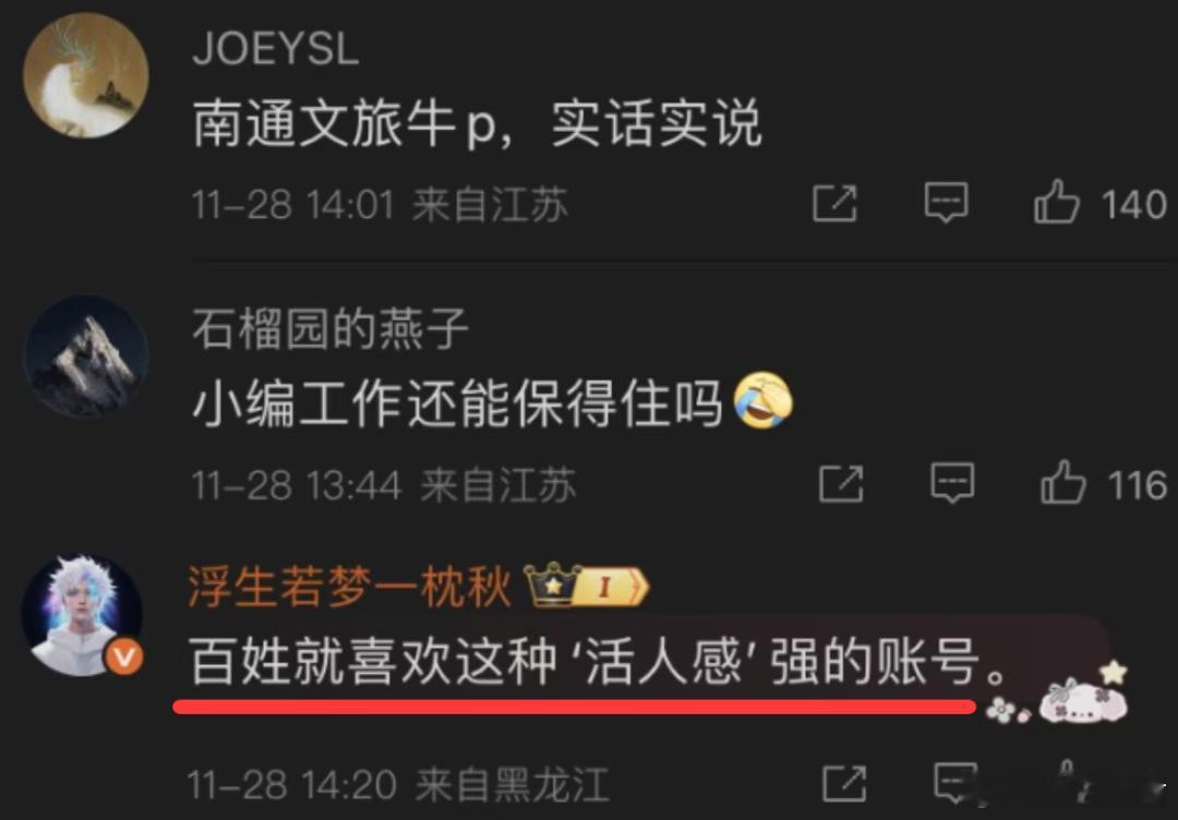 太勇了!南通文旅用6个字,斩获200万粉丝……南通文旅上热搜了。而且还霸占了社会热搜榜前三榜单中的两个席位:在热搜的榜单上我们能看到,这里写的是“南通文旅一夜涨粉超过32万”。但是实际情况是,这个数据,已经远远过时了,因为到目前为止,南通文旅的粉丝数,已经涨到了200多万!这是网友们统计出来的前几天的各地文旅账号的粉丝数:可以看到,就在前几天,南通文旅的粉丝数,还是停留在三十多万的水平。然而从昨天开始,网友们就发现,南通文旅的粉丝数,已经开始控制不住了:这是我写这篇文章的时候,南通文旅的粉丝数:必须说明的一点就是,这个数据,是我在这一刻截下来的数据,并不代表涨粉数据已经停止了,因为我在截图之前还特意掐了一下秒表计时,计时后我发现,南通文旅的粉丝数据,如今一直是在按每秒增加几千粉的数字在疯涨!那么,为什么南通文旅的粉丝数今天一直在疯涨呢?原因就是,南通文旅的账号,最近在某个新闻的下面,评论了6个字。哪6个字呢?就是这6个字:这6个字的评论,到底说得对不对,在这里我就不过多评论了。毕竟在一些政策法规的制定和出台这块我不是专业的,对于我不知道的事,我就不多说了。但是我知道的是,南通文旅账号打出的这6个字,在单位里肯定是不被允许的,特别是在某些体制内的官方账号里,这类文字肯定是更加不允许出现的。毕竟众所周知,某些体制内单位的对外账号,通常都是以“严肃”、“一本正经”、“不苟言笑”的面目示人的,这些账号,是决不允许工作人员随意对外展露出自己的“真性情”、“有个性”以及“调侃开玩笑”这类形象的。所以当南通文旅的账号打出了这6个字之后,这也让很多网友都替南通文旅捏了一把汗,所以在评论区,网友们纷纷给南通文旅做出了这样的留言:总之,就因为6个字,南通文旅的小编就帮助南通文旅斩获了几百万的粉丝。仅凭6个字,就拿下几百万粉丝,为什么会这样呢?关于这个问题,一个网友的留言,让我印象特别深刻:这位网友表示——我们老百姓,就喜欢这种“活人感”很强的账号。对于这位网友的留言,我是深表赞同的。毕竟哪条法律规定了,体制内的基层工作人员就必须要一本正经的?有哪条法律规定了,身为体制单位的工作人员,就一定要以严肃刻板的形象示人的?基层工作人员也是人,他们表达一下自己的情绪,他们展示一些自己的真性情,这又有何不可呢?此时此刻,我又想起了《西游记》里的一些事。话说在《西游记》里,唐僧师徒四人为大唐做事,为佛祖做事,他们就是一个很典型的体制内工作人员形象模版。那么,这师徒四人,你觉得他们受大众欢迎程度的排行榜,会是怎样的呢?是这样的:在唐僧师徒四人里,最受大众欢迎的,是孙悟空,其次是猪八戒,再然后是唐僧,最后是沙僧。沙僧这个人,非常老实本分,而且任劳任怨,在取经路上他只是默默做好自己挑担子的工作,从不多话,也从不掉链子——这种人要放在体制里,肯定是领导最喜欢的员工。但是在取经团队的师徒四人中,为什么沙僧却是最不受大众欢迎的人物呢?我认为最根本的原因,就是沙僧这个人,太“体制模板化”了。换句话说就是,这个人,太刻板、太老实、太没有个性了,他活得像个标本。一个标本,是不会给大众留下什么深刻印象的。但是孙悟空和猪八戒呢,就不一样了。比如孙悟空这个人,一有什么不满,他会立刻表达出自己的真性情,他直接喊玉帝叫玉帝老儿,直接叫太上老君为老倌儿,对待如来佛祖,他不仅敢在他面前耍无赖,还敢称呼他是胖老头……这样的人,虽然有点没大没小,但他是不是更像一个活人?是不是更招人喜欢?还有猪八戒,他虽然好吃懒做,爱打小报告,甚至还色胆包天,他不仅调戏嫦娥,还在取经路上多次说不想干了,想回自己的高老庄娶媳妇了,虽然这种人在领导眼里是妥妥的废材,但是在普通人的眼里,这种人,是不是更像一个活人,是不是更让人印象深刻?而沙僧呢,这个人除了每天任劳任怨、干好自己的工作(挑担子)外,他就从不多说一句话了。即便说话,也是两句话——“大师兄,师傅被妖怪抓走了”、“大师兄,二师兄被妖怪抓走了”……请问,这种人,你会喜欢他吗?你会跟他交朋友吗?所以回到文章最开始的话题——为什么南通文旅仅仅用6个字,就斩获了上百万粉丝?其中一个很重要的原因,就是虽然这个账号的小编干了一些在体制里越界的事,但是他却展示出了这个账号的“活人感”。有些账号,也许不完美,但正是因为他们的不完美,让他们显得更亲切,显得和我们更加没有距离感。实际上,一个人真正的魅力,并不是他的“稳定性”和“确定性”,而是在于他的“复杂性”和“多面性”——所以对于一些单位,我想说的是,如果你们想让你们的工作能与大众更进一步拉近距离的话,那么,你们就应该允许你们的员工适当表达一下态度,别让他们总以一副严肃、刻板的形象示人。因为大众喜爱的,永远是那些有血有肉、会哭会笑、有优点也有缺点的“人”,而不是完美无瑕、却冰冷如标本的“神”!毕竟,我们每一个人,都渴望在他人身上,看到一个同样不完美,但却真实、生动的自己……
