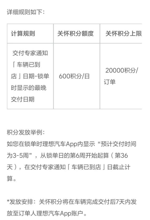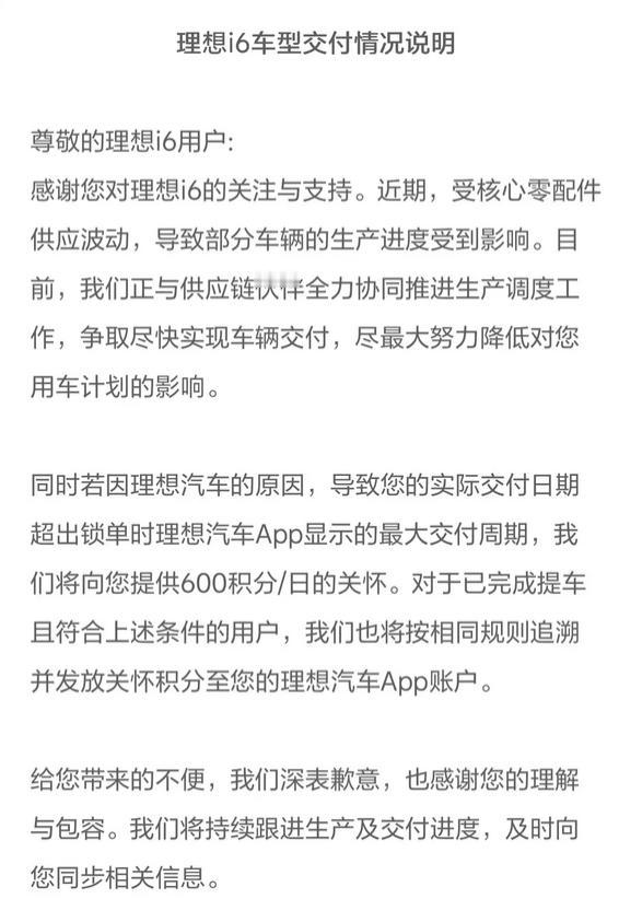 受核心零配件供应波动 部分理想i6或将延期交付 官方发布补偿方案 日前,理想官方发布信息,近期,受核心零配件供应波动,导致部分理想i6的生产进度受到影响。 目前,理想汽车正与供应链伙伴全力协同推进生产调度工作,争取尽快实现车辆交付,尽最大努力降低对用户用车计划的影响。 同时,理想汽车也公布了如发生交付延期情况的补偿方案。若用户实际交付日期超出锁单时理想汽车App显示的最大交付周期,理想汽车将向购车用户提供600积分/日的关怀。对于已完成提车且符合上述条件的用户,理想汽车也将按相同规则追溯并发放关怀积分至用户的理想汽车App账户。 理想汽车对部分用户的延迟交付致歉,理想汽车表示将持续跟进生产及交付进度,及时向用户同步相关信息。 点个关注吧!汽节车社,车圈热点资讯每日一扫清!【来自懂车帝车友圈】