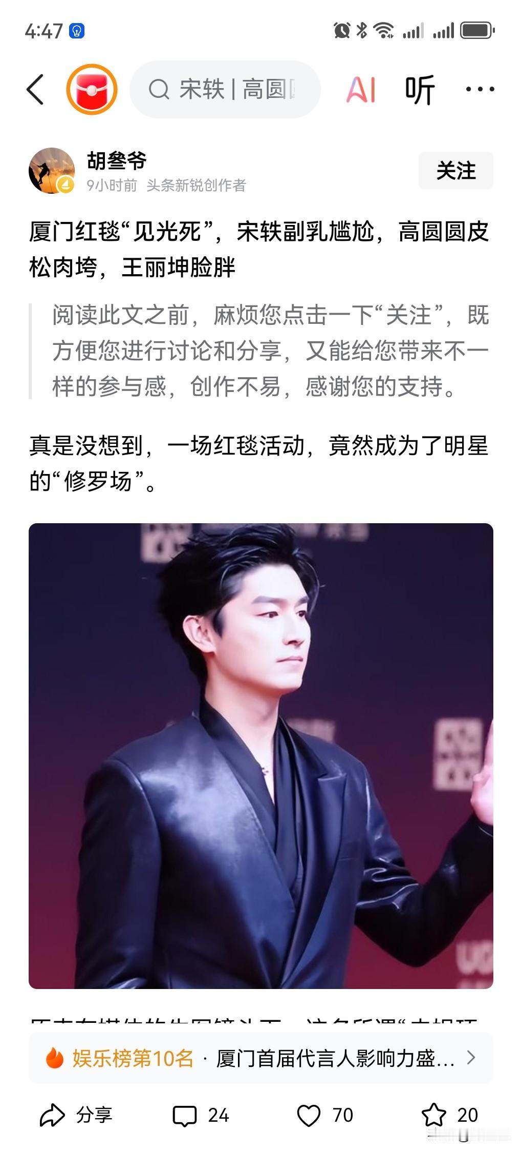 有报道说厦门红毯成了修罗场,“见光死”,说宋轶副乳尴尬,高圆圆皮松肉垮,王丽坤脸胖。 虽然成为女明星或者说公众人物,难免会被公众审视,但平心而论,名人首先也是人啊,是人就有优缺点,没有完美的,不要用自己臆想中的所谓的完美去套在一个活生生的人的身上,多谢包容,少些苛责! 至于所谓的明星们,她塑造的角色,你喜欢或者说能在闲暇时给你一个放松或者解闷的时刻就是成功的!