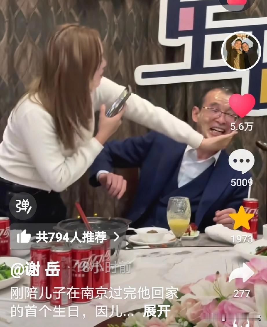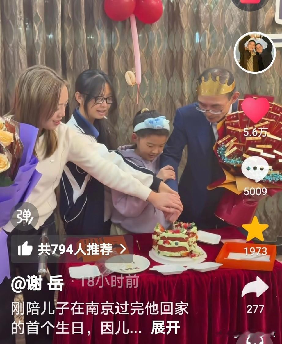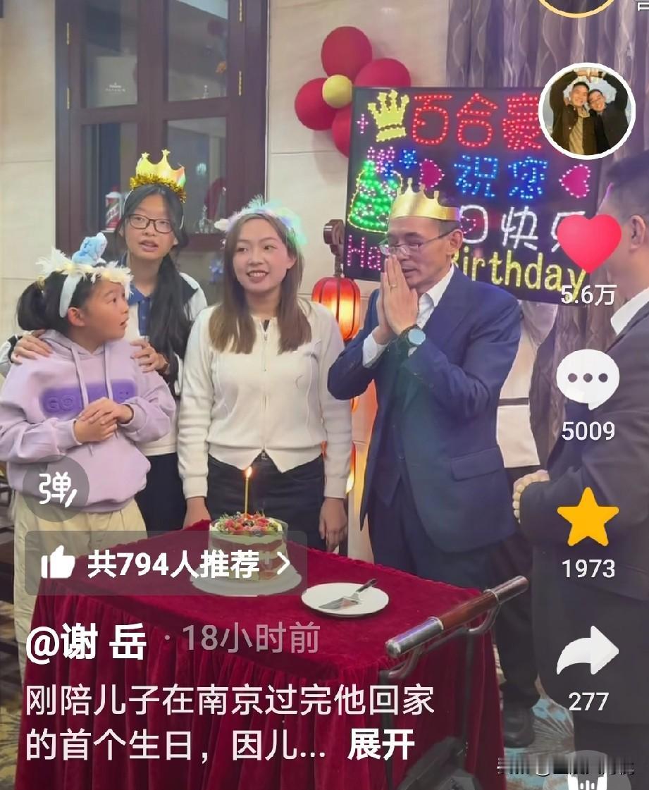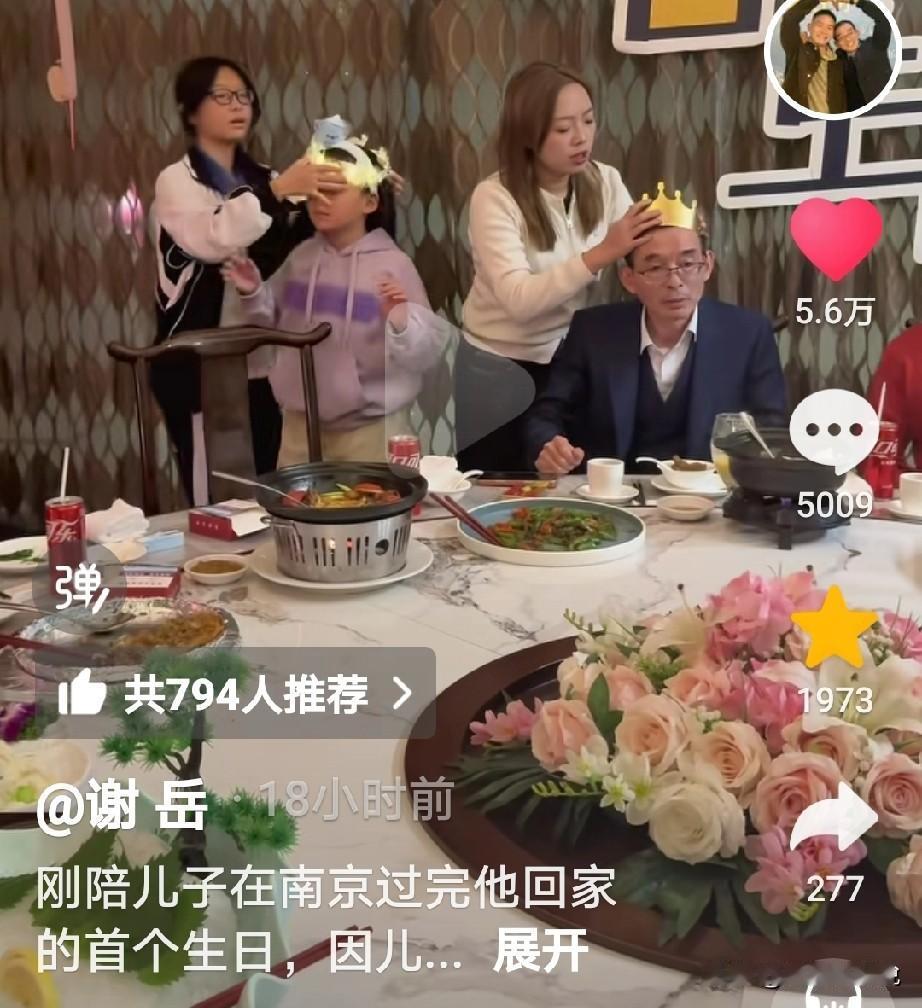 谢岳给谢浩男过完生日就那边马不停蹄的赶回来, 家里这边也给他准备了一个盛大的生日晚宴, 有网友说,要是亲妈妈许建华在就好,那就更完美了 前天看到谢岳一个人跑到了谢浩男的南京学校去给谢浩男过生日,然而就在昨天,是谢岳的生日 谢岳这身边的这几个子女都在他的身边给他过生日, 视频里看着谢岳和几个子女互动很开心,大妹妹很调皮