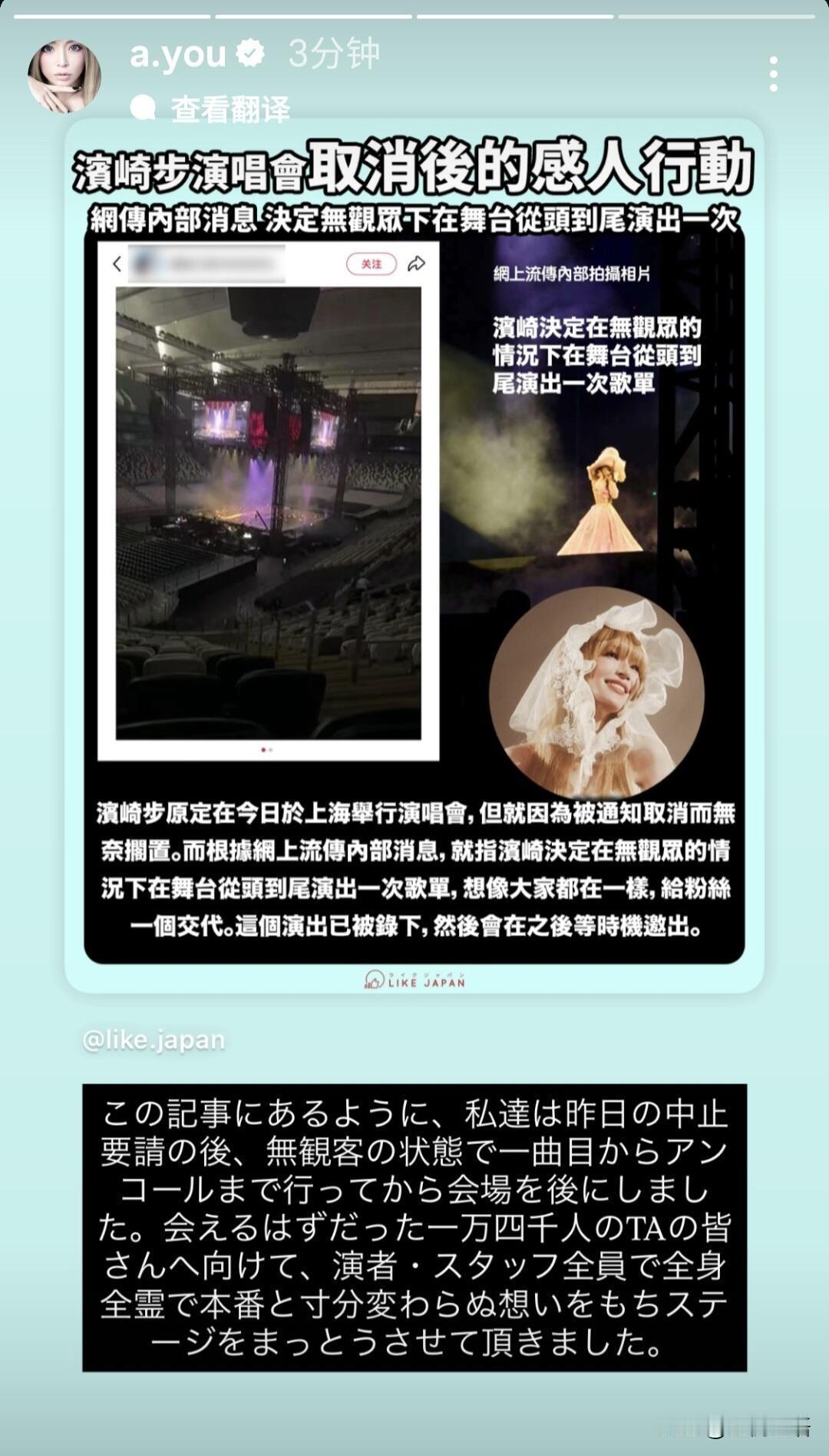 滨崎步这场“无人演唱会”, 看哭一万四千人! 原定于11月29日的上海演唱会, 突然被通知取消了。 一万四千名观众,有人刚到场馆, 有人连夜赶路,满心期待落了空。 可谁也没想到, 滨崎步没有选择放弃。 没有观众,没有欢呼, 她独自站上搭了5天的舞台。 对着空无一人的场馆, 唱完了一整场歌。 200多个工作人员坚守到最后, 她把遗憾唱成了温柔。 说不用有人自责,大家都拼尽了全力, 说娱乐是连接人心的桥,她要一直守着。 这哪里是演唱会啊, 是一个歌手对舞台的敬畏, 是对歌迷最真诚的回应。 隔着屏幕都看破防了, 这样的滨崎步, 真的让人忍不住心疼又敬佩!