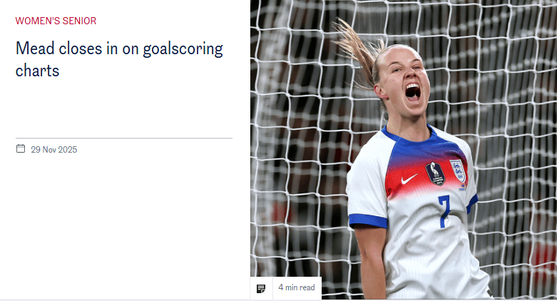 虎扑11月30日讯贝丝-米德距离成为英格兰女足历史第五大射手仅差一球。这位前锋在温布利球场对阵中国队的比赛中梅开二度,帮助球队以8-0大胜对手,距离法拉-威廉姆斯保持的40粒英格兰队进球纪录仅一步之遥。