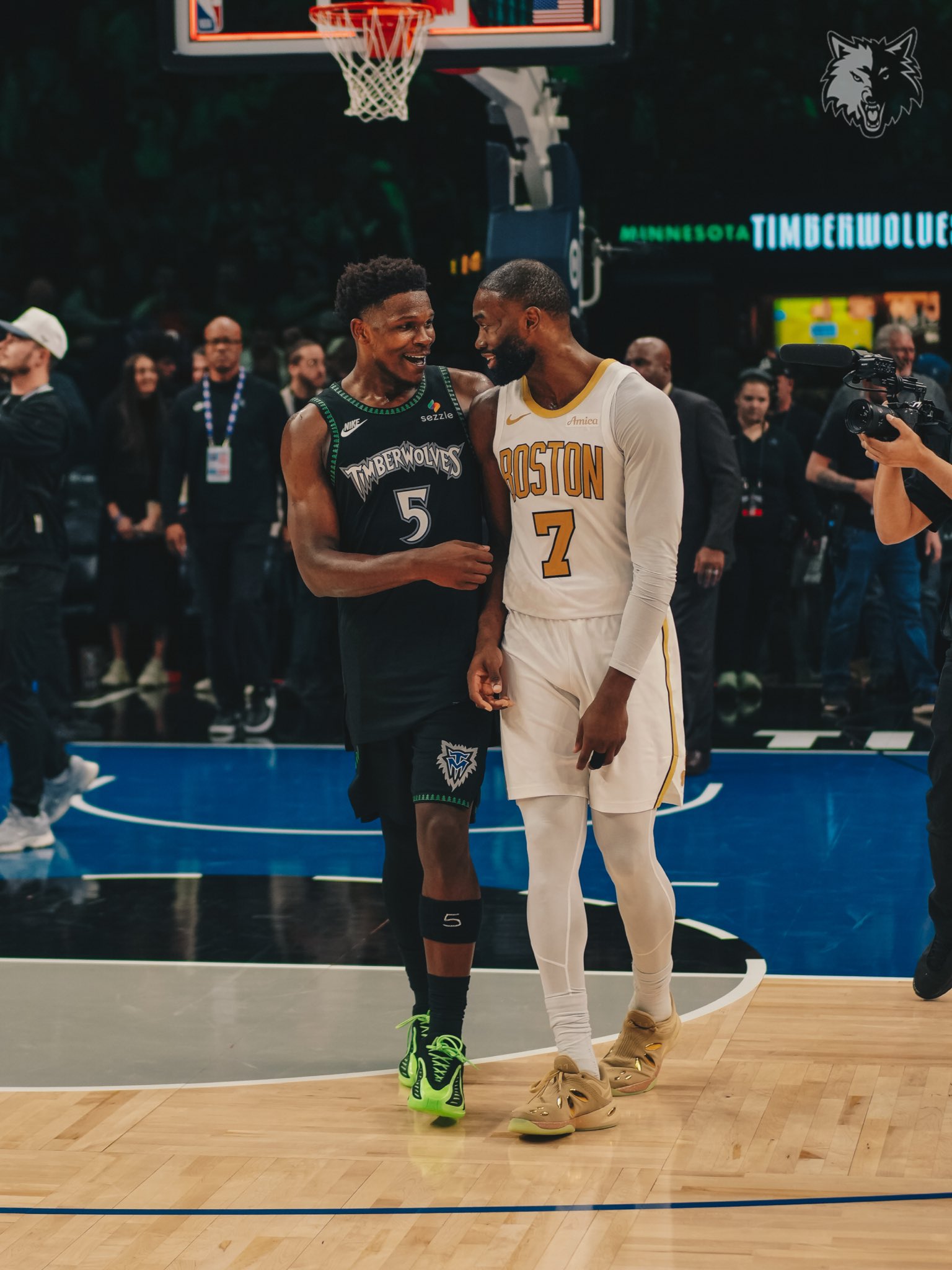 赛后,森林狼社媒晒出比赛结束后爱德华兹分别与杰森-塔图姆与杰伦-布朗互相亲切问候的照片。