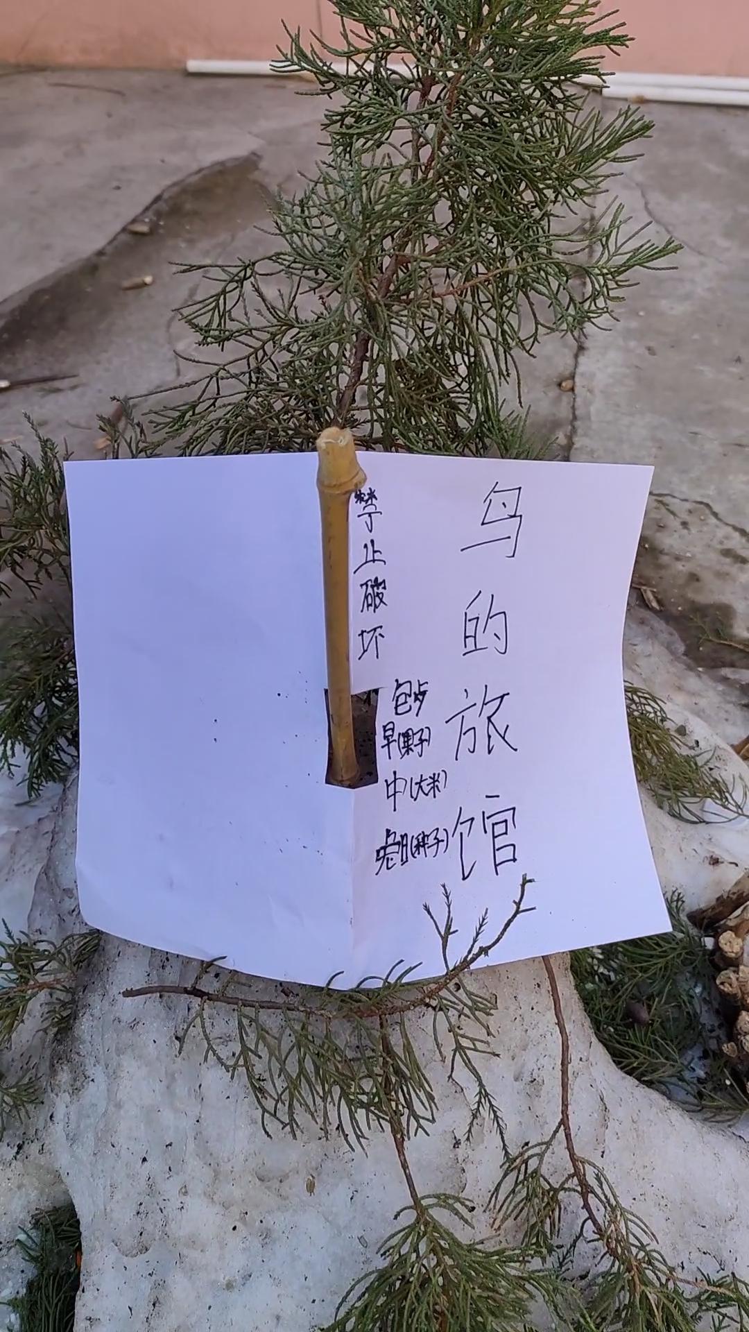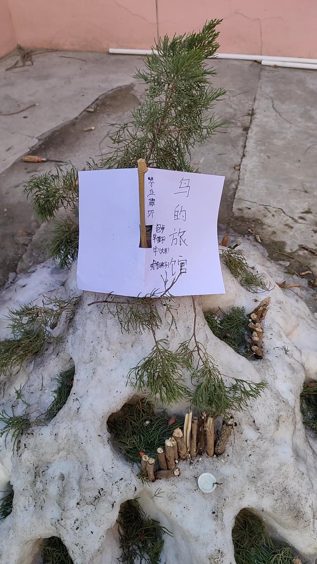 分享一张雪景图用雪堆出的“鸟的旅馆”,凹洞里藏着小树枝搭的巢,还别出心裁插了松枝当装饰。纸片上的字带着认真的温柔——这是给流浪小鸟们的临时避风港,每一处细节都是软乎乎的善意~