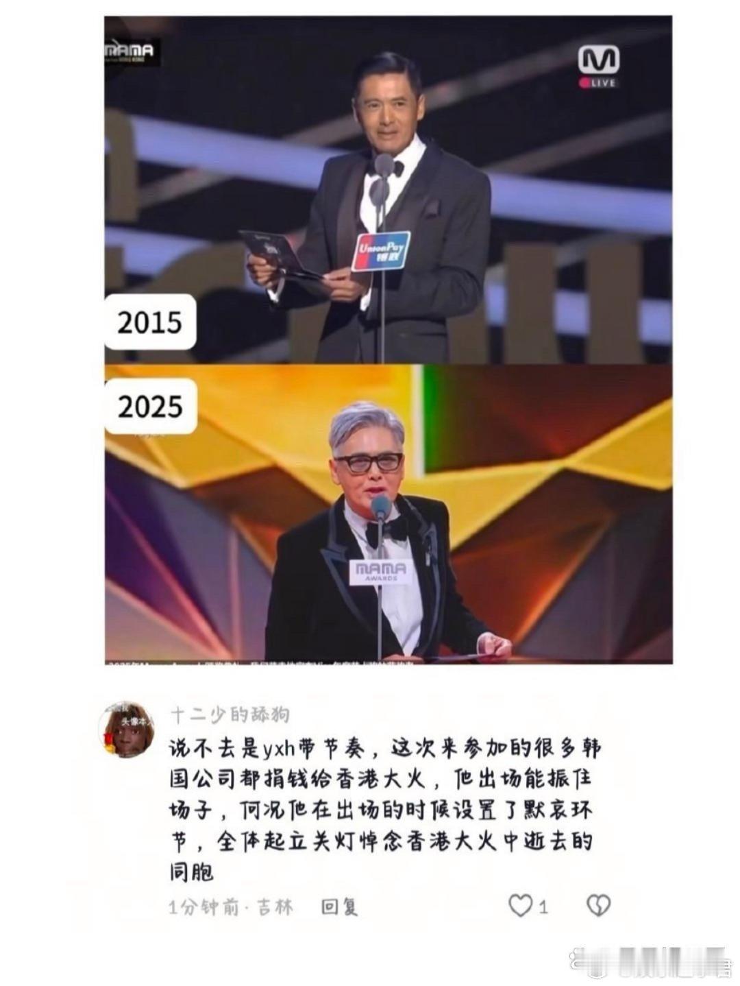 周润发快哭了周润发出席mama,周润发快哭了,一头银发,带全场观众为香港大火默哀。10年前他就参与颁奖,十年后他依旧站在舞台上,还给权志龙颁奖,出席应该也是为了这个才来的吧,发哥在也也能镇住场。发哥跟十年前比真的老了好多,周润发 mama!