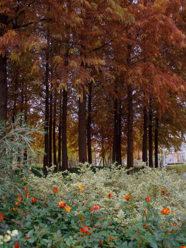 脚下是松软的落叶,耳边是风吹枝叶的沙沙声,落羽杉林,红、黄、绿三色交织,宛如大自然打翻的调色盘。