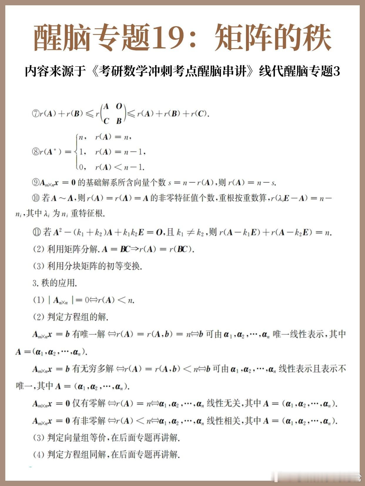 【D21】考研数学30天急救计划!【醒脑专题19】:矩阵的秩30天30个核心专题,把数学重要的公式和考法总结回顾一遍!每天背一背,写一写,不负过往,终将上岸!决战考研 考研 考研数学