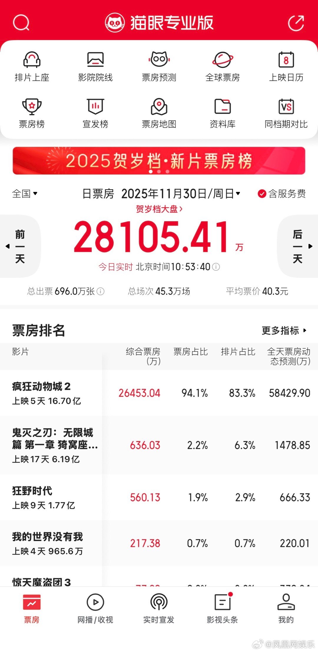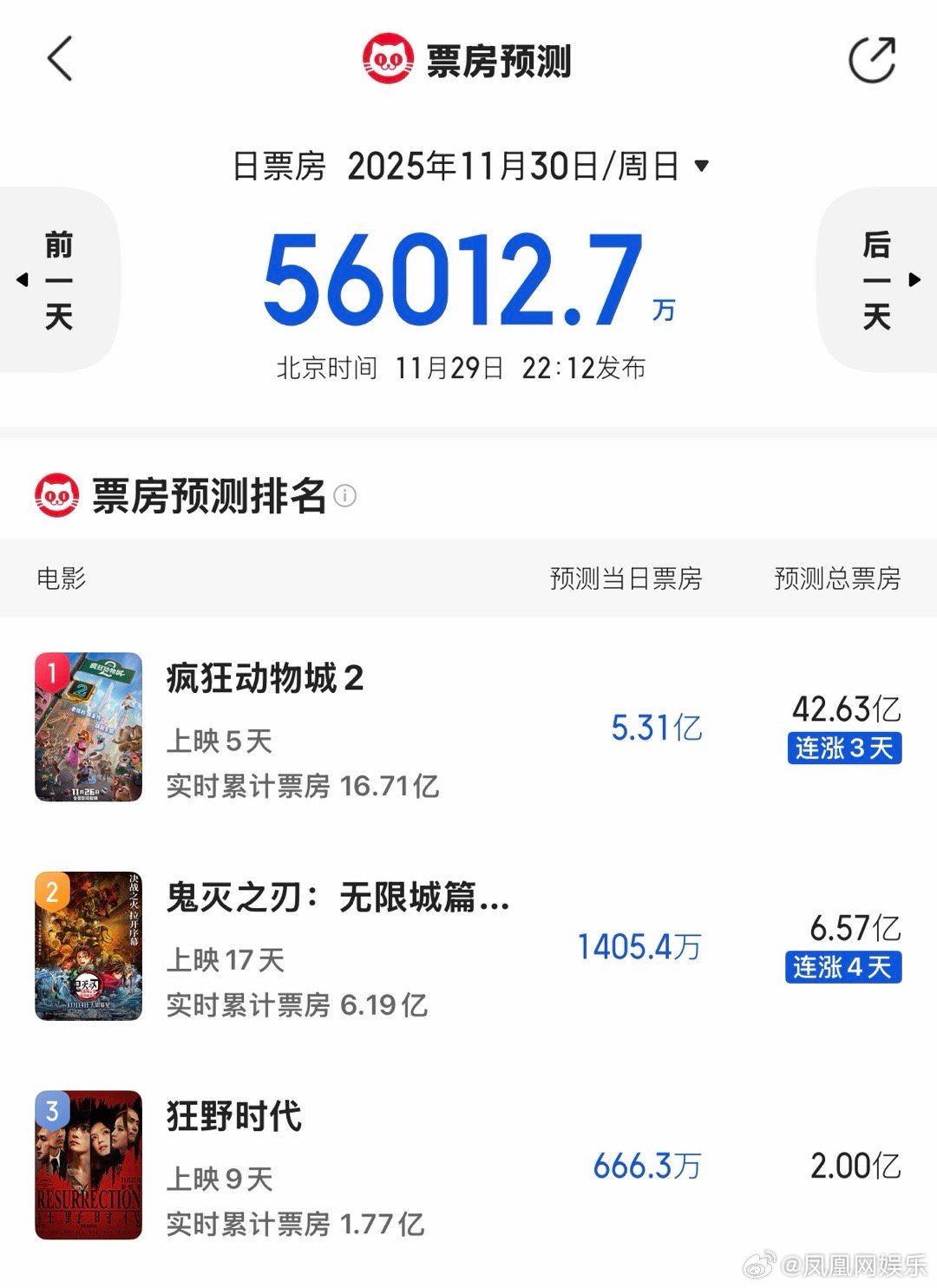 疯狂动物城2排片 11月26日,《疯狂动物城2》上映首周便掀起“动物城风暴”,截至11月29日(周六),影片单日票房飙至7.38亿元,不仅超越《复仇者联盟4》的5.53亿,登顶中国影史进口片单日票房冠军,更成为影史首部单日突破1亿美元的进口电影。同日观影人次达1871万,超过《哪吒之魔童闹海》上映第七天的1732万,刷新内地影史动画电影单日单片人次纪录。11月30日影片排片占比突破80% ,部分影院排片率甚至超过九成,票房占比维持在90%以上的高位。从早场开始便呈现爆满态势,即便清晨8:30的场次也座无虚席,黄金场次更是一票难求。某影院经理直言:“这个时间段,《疯狂动物城2》没有对手,一些影厅数量少的影院全天只排这一部片子,周末热门场次的角落座位都得抢。” 这种热度也带动大盘回暖。随着电影热度攀升,专业平台票房预测持续上调到42亿元,若势头延续,影片不仅将超越《速度与激情8》(26.7亿元)成为国内进口片亚军,更有望挑战《复仇者联盟4》(42.5亿元)的进口片冠军纪录。目前影片全球票房3.13亿美元中,中国内地贡献2.06亿美元,北美仅5920万美元,中国已成为无可争议的全球最大票仓,为冷清近半年的电影市场注入强劲活力。凤凰院线经理指数