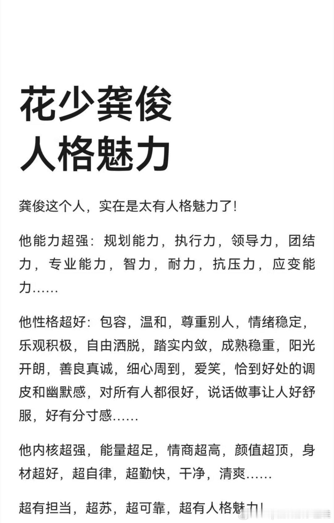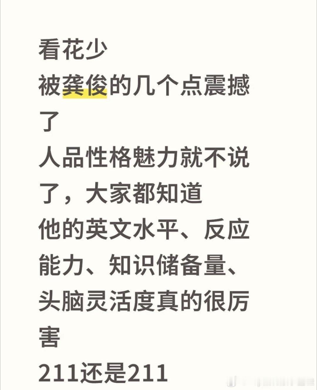 业内和媒体工作人员对龚俊几乎都是敬佩与夸赞,没有谁比他们更了解行业内幕,演员拼到最后拼的是人品和文化,龚俊是一位能力强 脑子灵活 涵养好的演员!