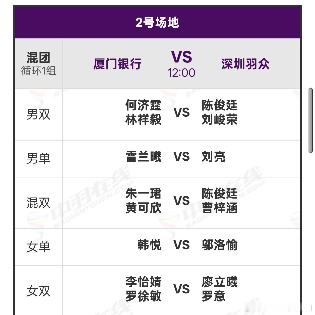 羽超联赛 11月30日12点对阵名单:【1号场地:青岛仁洲 🆚 辽宁极兔】男双:梁伟铿/吴拓斌 vs 任翔宇/谢浩南男单:曾逸凡 vs 翁泓阳混双:吴拓斌/张驰 vs 郭新娃/刘圣书女单:王祉怡 vs 陈昕彤女双:刘嘉悦/王漪朵 vs 贾一凡/刘圣书【2号场地:厦门银行 🆚 深圳羽众】男双:何济霆/林祥毅 vs 陈俊廷/刘峻荣男单:雷兰曦 vs 刘亮混双:朱一珺/黄可欣 vs 陈俊廷/曹梓涵女单:韩悦 vs 邬洛愉女双:李怡婧/罗徐敏 vs 廖立曦/罗意