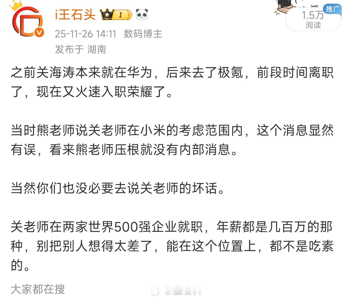 昨天关海涛来串门,大概率是因为我发的这条,看来关总对其中的观点有些认同。关总也很清楚熊老师压根没啥内部消息吧!另外关总还在xhs发了一个帖子,说是拒绝了所有车圈品牌的邀请,把车圈最深的情感都留给了极氪。这说明在入职荣耀之前,关总还接到了其它车圈品牌的邀请。如我前文所说,关总曾在两家500强企业就职,别把人想太差,在这个位置都不可能摸鱼,没点人脉手段还真上不了位。