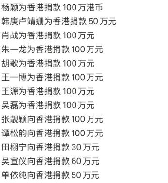 内娱艺人捐款支援香港名单公布。 不少人吐槽:香港那么富,这又不是天灾,咋有种农