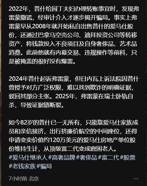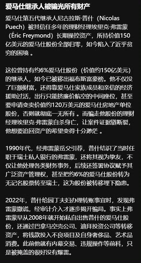 爱马仕继承人塌房!赠园丁530万,却被理财师骗走150亿,如今挤廉航度日 谁能想到顶级豪门也会遭“杀猪盘”?爱马仕第五代继承人尼古拉斯·普埃奇的经历,比电视剧还魔幻! 这位大佬之前多宠园丁啊——送豪华别墅、赠土地,光零花钱就给100万欧元,还打算遗赠90亿欧元遗产,结果2022年给园丁转钱时,对方说压根没收到!一查才发现,自己价值150亿美元的爱马仕股票,早被服务20多年的理财师偷偷卖光了! 理财师一边伪造文件骗他“股份还在”,一边切断他和亲友联系,用赃款买豪宅、投资电影,甚至在2025年还冒名帮他签了150亿的股票买卖合同,导致他被卡塔尔公司起诉索赔13亿。更离奇的是,理财师受审后没多久就被火车撞死,警方认定自杀,留下一堆谜团。 如今80多岁的普埃奇,从亿万富豪变成靠亲戚接济的老头,飞伦敦只能挤廉航中间座。网友调侃:“宠园丁掏心掏肺,防小人毫无防备”。 这事儿也提醒大家:再信任的人,涉及钱和签字都得留个心眼!你要是有巨额财富,会把资产全权交给别人管吗?来评论区聊聊你的理财防坑小技巧